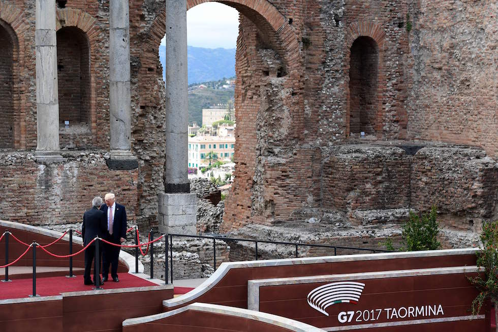 Paolo Gentiloni con Donald Trump prima della foto di gruppo per il G7 di Taormina