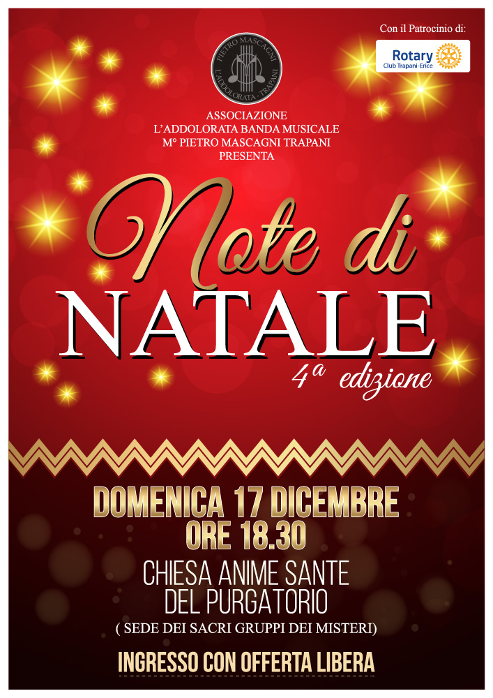 Si terrà Domenica 17 Dicembre alle ore 18.30 a Trapani presso la Chiesa Anime Sante del Purgatorio (sede dei Sacri Gruppi dei Misteri) la 4° edizione del concerto ” Note di Natale”. “Anche quest’anno abbiamo messo il massimo impegno, insieme a ognuno dei componenti della nostra realtà musicale, affinché il nostro piccolo ma – speriamo – grande contributo possa essere utile a questa nostra amata città, troppo spesso sofferente e abbandonata a sé stessa. Ringrazio il Rotary Club Trapani-Erice che ha offerto la propria collaborazione in questo progetto a sostegno delle famiglie meno abbienti.” Queste le parole del presidente , Emanuele Barbara.