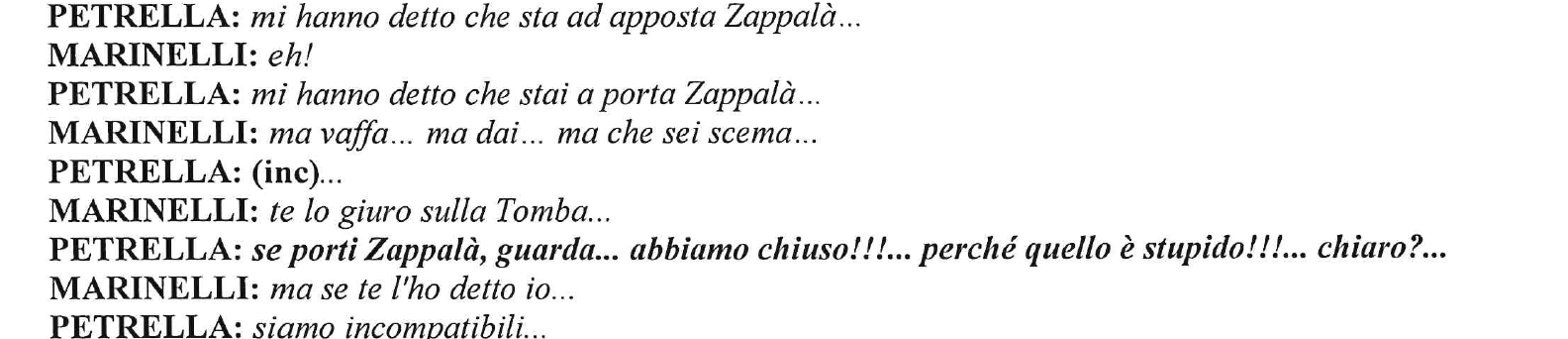Questa intercettazione ne fa il paio con un'altra, che meriterebbe da parte del diretto interessato anche della chiarezza. Sono sempre Marinelli e Petrella che parlano. Lei, la funzionaria pubblica, aspetta da lui, l'imprenditore della sanità, una raccomandazione per diventare dirigente, guadagnare di più, avere un ruolo ancora più apicale. Si sente trascurata. Non gli perdona di "accontentare tutti", annotano gli investigatori, mentre lei è "da tre anni che aspetta". Al telefono con Verna (altro funzionario dell'Asl arrestato nell'operazione), parla di altri candidati sistemati da Marinelli, o da sistemare: "Ora c'è pure la Cavalli a Pescara! A Pescara!! Che poi secondo me la Cavalli non la conosce nessuno! E' lui che la porta! Come ha portato Zappalà, lui!".