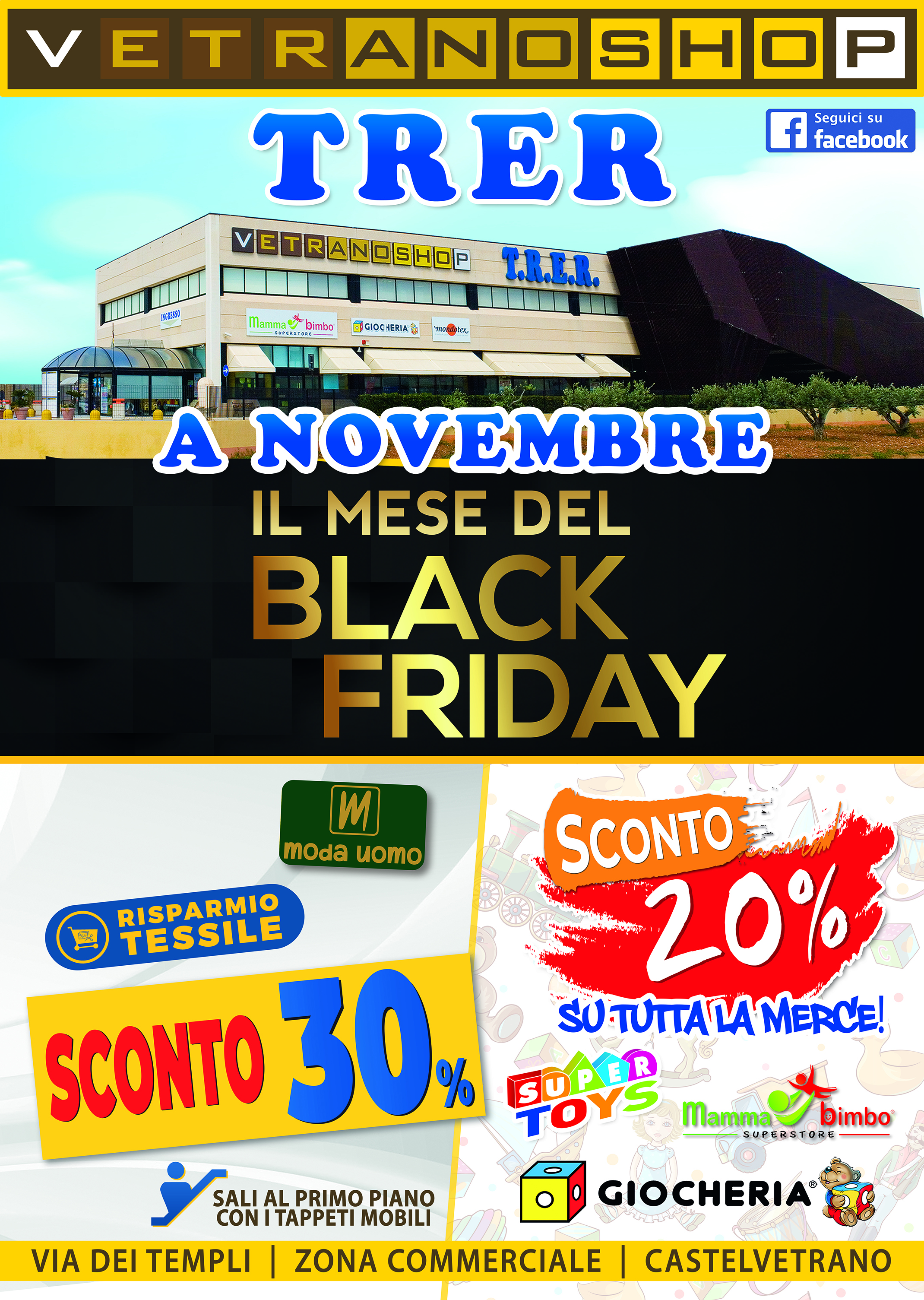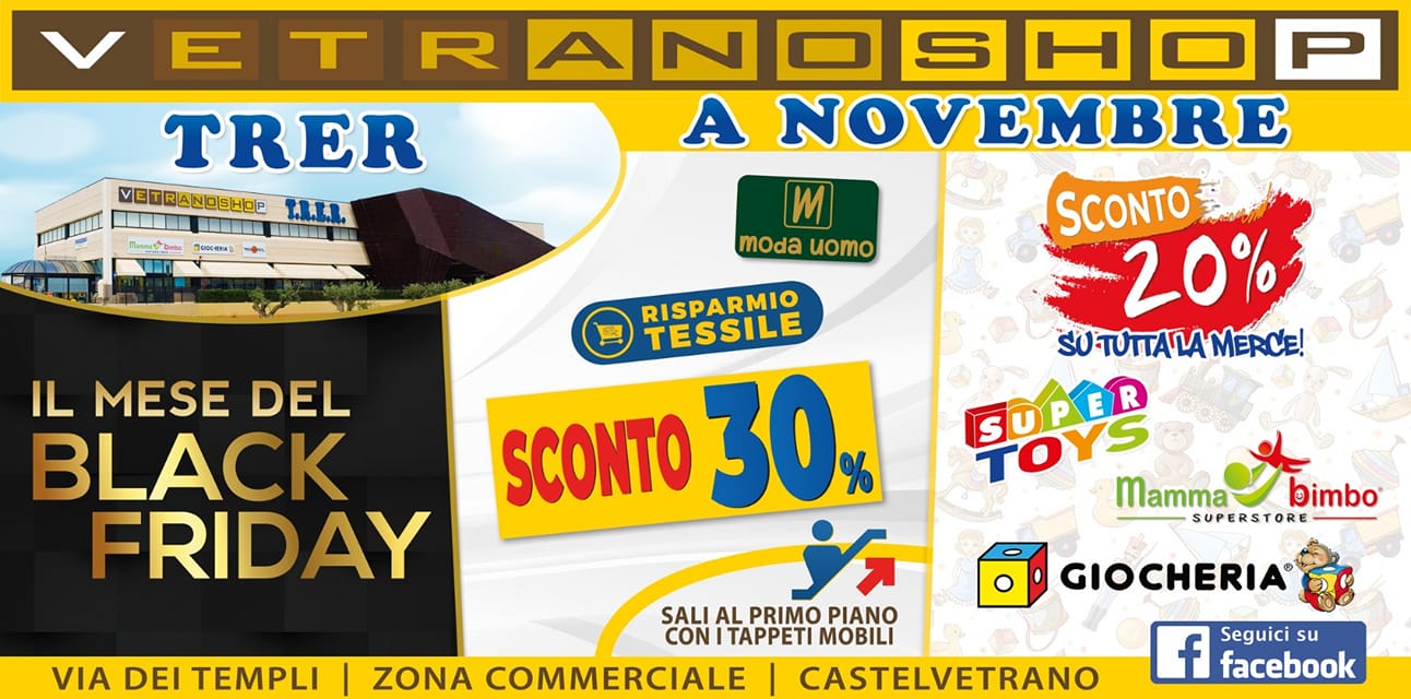 Anche quest’anno non poteva mancare il Black Friday al centro Vetranoshop TRER nella zona commerciale di Castelvetrano. In tutti i reparti - escluso soltanto quello dedicato all'alimentazione per neonati e pannolini - è possibile trovare sconti dal 20% al 30% mai visti, con promozioni valide fino al 30 novembre in occasione dell’evento più atteso di questo periodo.