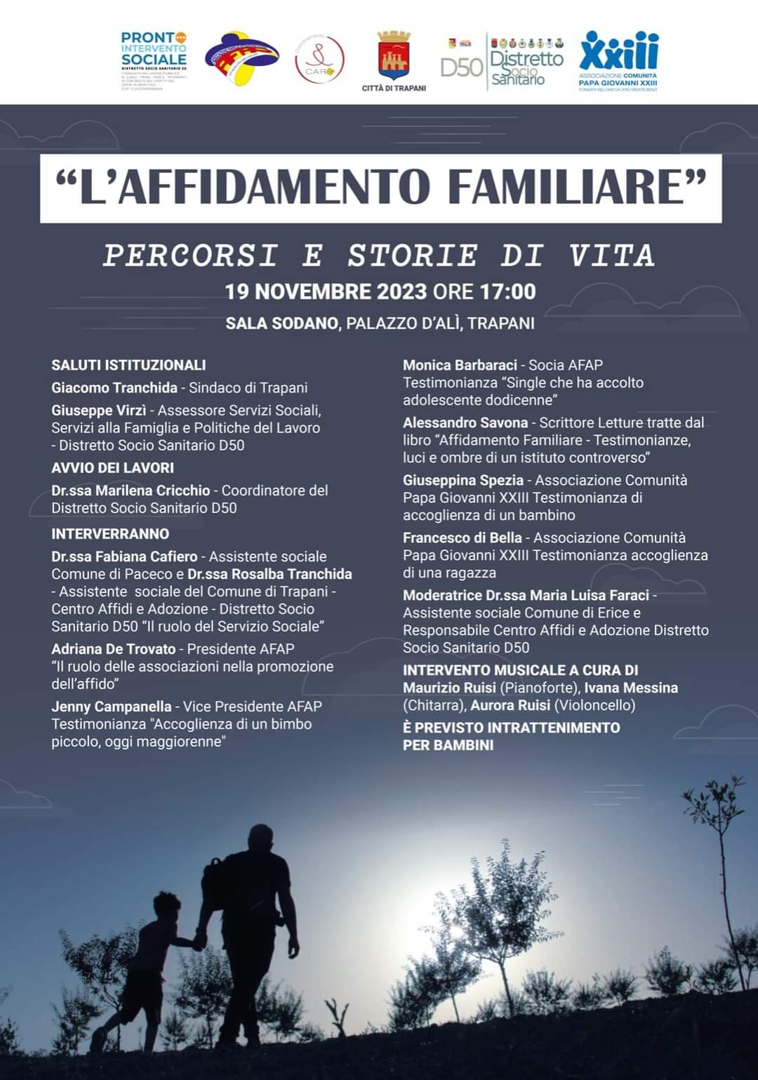 TRAPANI - Domenica 19 novembre alle 17.00 presso Sala Sodano di Palazzo d'Alì a Trapani si terrà "L’affidamento familiare", iniziativa informativa organizzata dal Centro Affidi e Adozioni del Distretto Socio Sanitario D50 in collaborazione con il Comune di Trapani, il Coordinamento Care e l’Associazione Comunità Papa Giovanni XXII. Sono previsti interventi musicali con pianoforte, chitarra e violoncello a cura di Maurizio Ruisi, Ivana Messina e Aurora Ruisi. Sarà inoltre organizzato intrattenimento per i bambini.