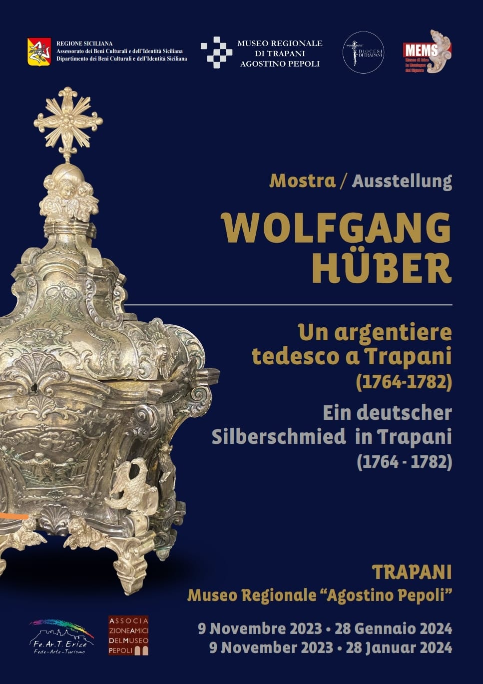 TRAPANI - Presso il Museo regionale di Trapani "Agostino Pepoli" è possibile visitare la mostra "Wolfgang Hüber. Un argentiere tedesco a Trapani (1764-1780), curata da Lina Novara e Pietro Messana. La mostra rimarrà aperta al pubblico fino al 28 gennaio 2024. Al Museo diocesano di arte contemporanea "San Rocco" di Trapani è aperta la mostra intitolata “Silenzio”, che presenta opere che emergono dal silenzio interiore dell’artista Stefano Gianquinto. L’esposizione è aperta dal giovedì alla domenica dalle 18.00 alle 20.00, con ingresso libero.