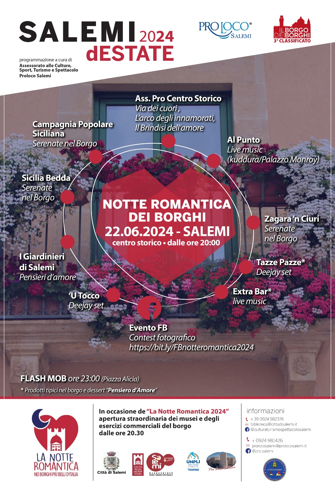 SALEMI - Torna anche quest'anno, il 22 giugno, la Notte romantica nei Borghi più belli d'Italia. L’appuntamento sarà celebrato anche a Salemi, dalle ore 20.00, con eventi che animeranno il centro storico. Quest’anno il fil-rouge della manifestazione sarà ”l'Amore per il nostro cibo” e ogni borgo è già al lavoro per predisporre il proprio programma: via libera, dunque, alla creatività e alla fantasia, per celebrare l’amore in una serata magica, dove riscoprirsi “romantici” nell’atmosfera dell’Italia dei Borghi. Dalla Valle d’Aosta alla Sicilia, tutti i Borghi saranno illuminati a lume di candela e offriranno un ricco programma di manifestazioni, iniziative ed eventi: attraverso il teatro, la musica, la danza, il cinema, mostre, concorsi vari e tanto altro, l’amore e il romanticismo saranno rappresentati e celebrati nelle piazze, nei palazzi e nelle vie dei Borghi.