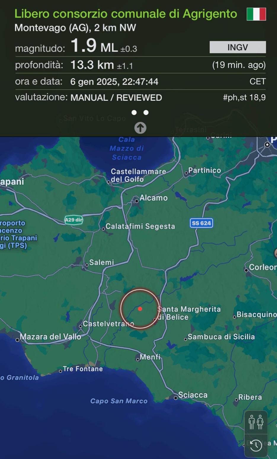 Un’altra scossa di terremoto ha interessato la valle del Belice, precisamente nel territorio di Montevago, in provincia di Agrigento. L’evento sismico, registrato dall’Istituto Nazionale di Geofisica e Vulcanologia (INGV), ha avuto una magnitudo di 1.9 ML, con una profondità di 13,3 km. La scossa si è verificata alle 22:47 del 6 gennaio 2025.