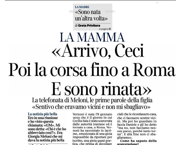 Cecilia Sala è tornata a casa ieri pomeriggio con un volo di Stato. La giornalista italiana, arrestata in Iran il 19 dicembre, è stata rilasciata ieri mattina. Il Falcon 900 di Palazzo Chigi era decollato poco dopo le 11 da Teheran per riportare in Italia l’inviata de Il Foglio e di Chora Media. Con la giornalista c’era il direttore dell’Aise, l’Agenzia informazioni e sicurezza esterna, Giovanni Caravelli, che è andato personalmente a Teheran per prendere la Sala. L’aereo è atterrato a Ciampino alle 16. Cecilia Sala è scesa da sola dall’aereo di Stato e ha trovato l’abbraccio liberatorio del compagno e collega giornalista Daniele Raineri. «Ciao, sono tornata», sono invece le prime parole inviate attraverso un messaggio vocale ai colleghi di Chora Media, la podcast company italiana per cui lavora. Ad accoglierla a Ciampino in una saletta riservata c’erano i genitori, Renato Sala e Elisabetta Vernoni. «Papà ti voglio bene, finalmente questa parentesi si è chiusa». E c’erano la presidente del Consiglio Giorgia Meloni, il vicepremier e ministro degli Esteri Antonio Tajani, il sindaco di Roma Roberto Gualtieri. La premier le ha stretto le braccia, ricambiata. «Bentornata! Non dire niente, adesso devi solo stare serena, ok? – le ha detto la Meloni – Sono qui per ringraziarti e dirti che sei stata forte».