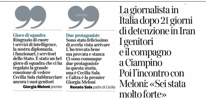 La notizia della liberazione di Cecilia Sala ha dominato la giornata politica. A Palazzo Madama, nella prima seduta del 2025, si è levato un applauso bipartisan. Il primo a chiamare la Meloni per congratularsi è stato il presidente della Repubblica Sergio Mattarella. In Senato sono intervenuti la sottosegretaria agli Esteri Maria Tripodirola. E poi Matteo Renzi: «Grazie al governo e grazie ai Servizi». La vicepresidente del Senato Licia Ronzulli (Fi) ha parlato di un «successo straordinario», il presidente Ignazio La Russa ha espresso «profonda gratitudine verso il governo». Un sentito «brava!» ha pronunciato Pierferdinando Casini all’indirizzo della premier. In un post pubblicato sui social Schlein, pur parlando con entusiasmo della liberazione della giovane giornalista, lo ha fatto aggiungendo il logo del Partito democratico a una foto di Cecilia Sala con la scritta «finalmente libera!». Sempre tra i dem si segnala la dichiarazione di Giuseppe Provenzano: «La liberazione della Sala restituisce onore all’Italia». Il portavoce di Alleanza Verdi e Sinistra, Peppe De Cristoforo ha evitato di indirizzare i suoi complimenti («Tutti hanno operato con grande senso di responsabilità e in condizione di massimo riserbo»). Che poi non è dissimile del vago «Grazie alle istituzioni per il risultato importantissimo», espresso da Chiara Appendino del Movimento Cinquestelle. Diametralmente opposta la reazione di Carlo Calenda, che proprio nell’aula di Palazzo Madama ha sottolineato: «Doveroso riconoscere al governo il merito per l’ottimo lavoro svolto». Sullo stesso registro l’ex collega di partito, Mara Carfagna: «Grazie al governo e alla nostra diplomazia per l’ottimo lavoro fatto in queste settimane difficili».