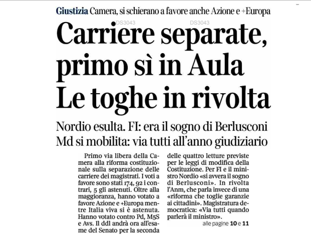 La Camera ha dato il primo via libera alla separazione delle carriere dei magistrati. La riforma modifica il titolo IV della Costituzione e prevede due Consigli superiori della magistratura separati, entrambi presieduti dal capo dello Stato.