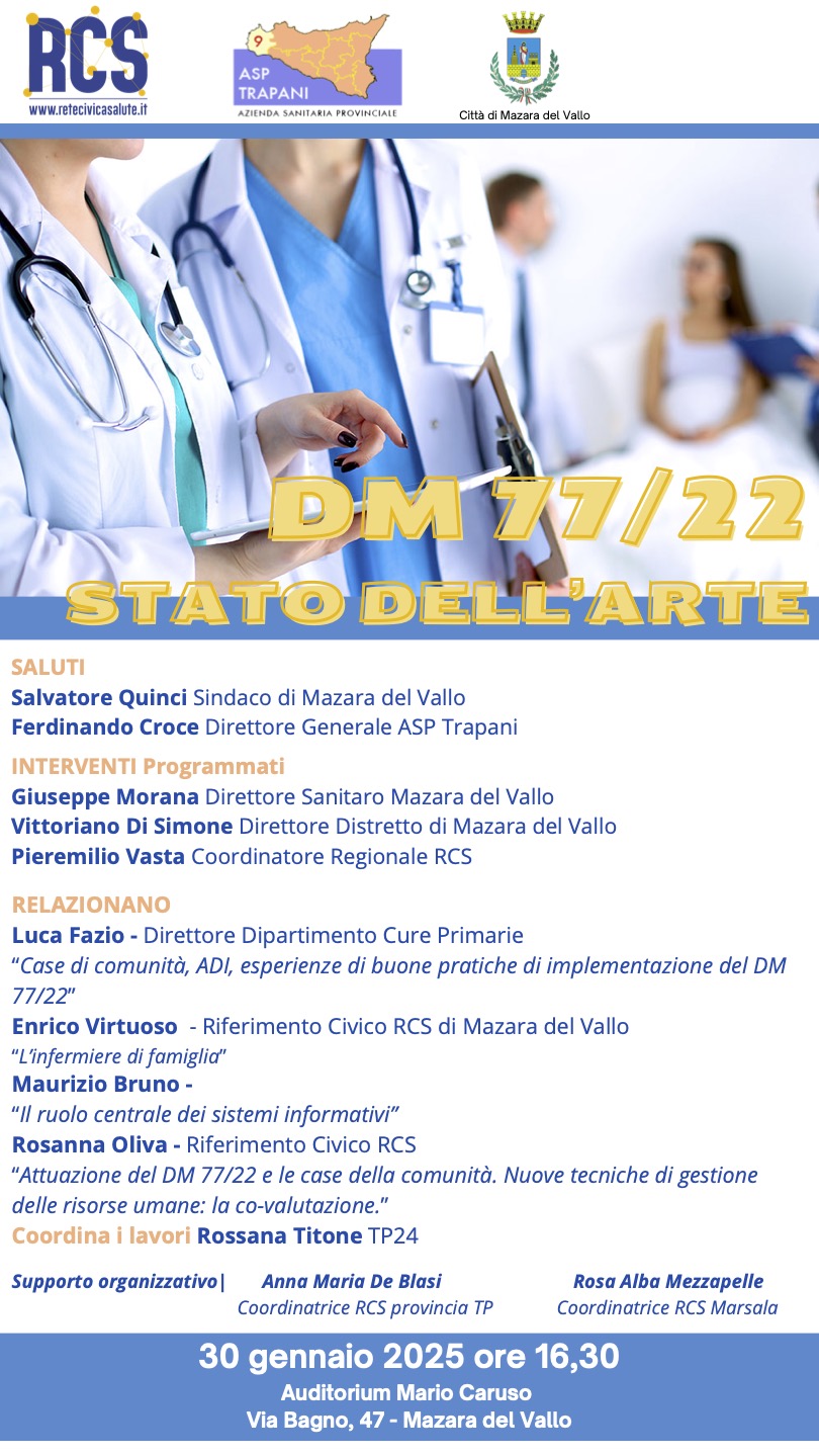 Il 30 gennaio 2025 alle ore 16:30, presso l’Auditorium Mario Caruso di Mazara, si terrà l’importante incontro dal titolo “DM 77/22: Stato dell’Arte”, organizzato dalla Rete Civica della Salute (RCS) in collaborazione con l’ASP di Trapani e il Comune di Mazara del Vallo.