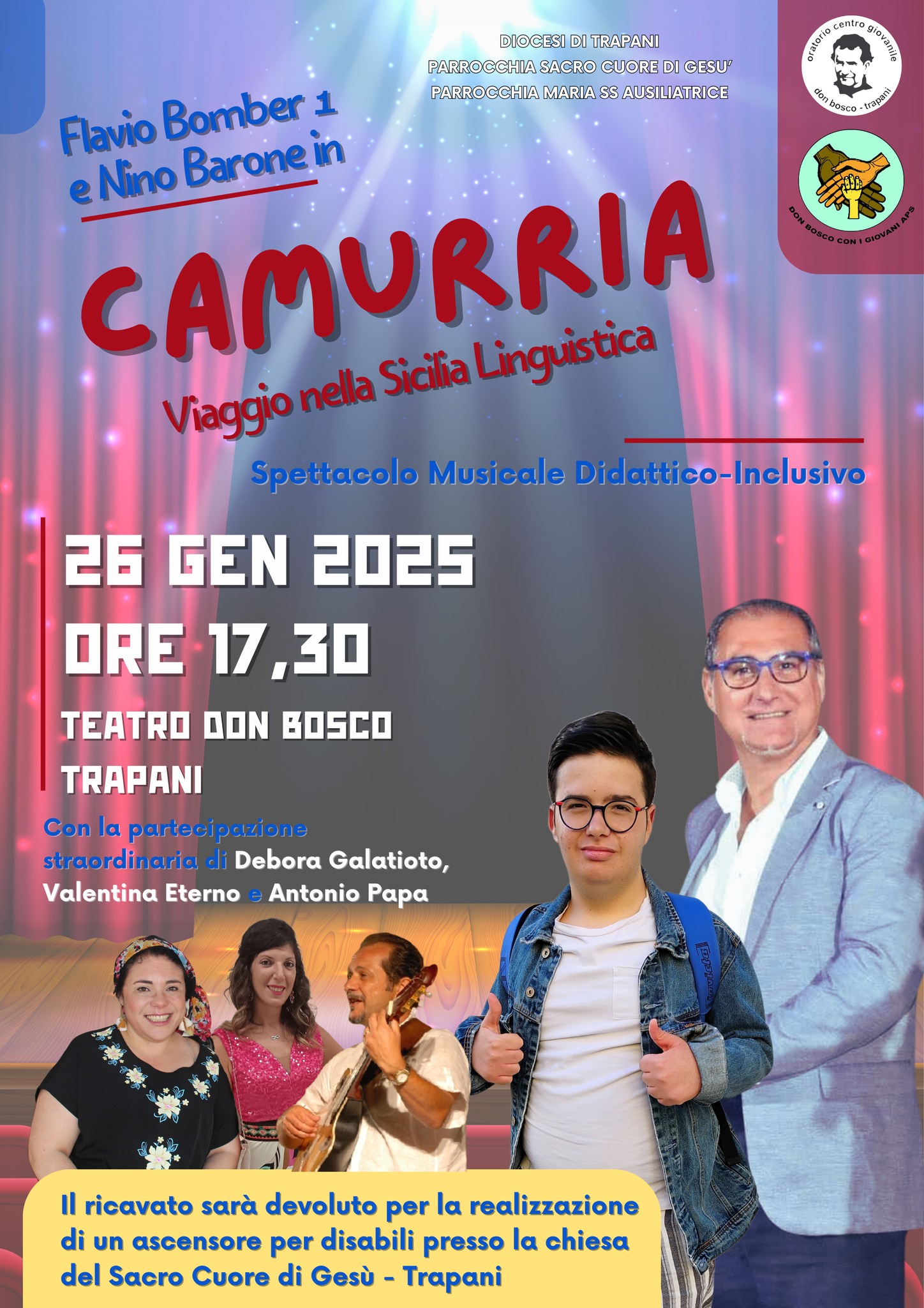 TRAPANI - Domenica 26 gennaio alle ore 17:30, al Teatro Don Bosco, si terrà lo spettacolo musicale didattico-inclusivo "Camurria - Viaggio nella Sicilia Linguistica" con Flavio Bomber 1, Nino Barone e Debora Galatolo. Il ricavato sarà destinato alla realizzazione di un ascensore per disabili presso la Chiesa del Sacro Cuore di Gesù a Trapani.