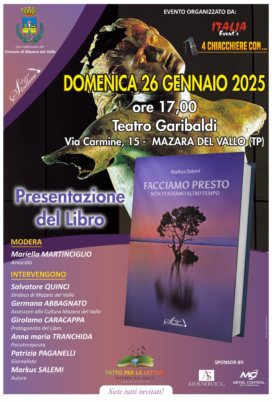 MAZARA DEL VALLO -Domenica 26 gennaio, alle ore 17, al Teatro Garibaldi di Mazara del Vallo, sarà presentato il libro “Facciamo Presto - Prima che sia troppo tardi” di Salemi Marcus. Il testo racconta un caso di buona sanità a Palermo e vede la partecipazione del protagonista Girolamo Caracappa e altri ospiti. L’evento è organizzato dall’associazione “Italia Events 4 Chiacchiere con...” e l’ingresso è libero.