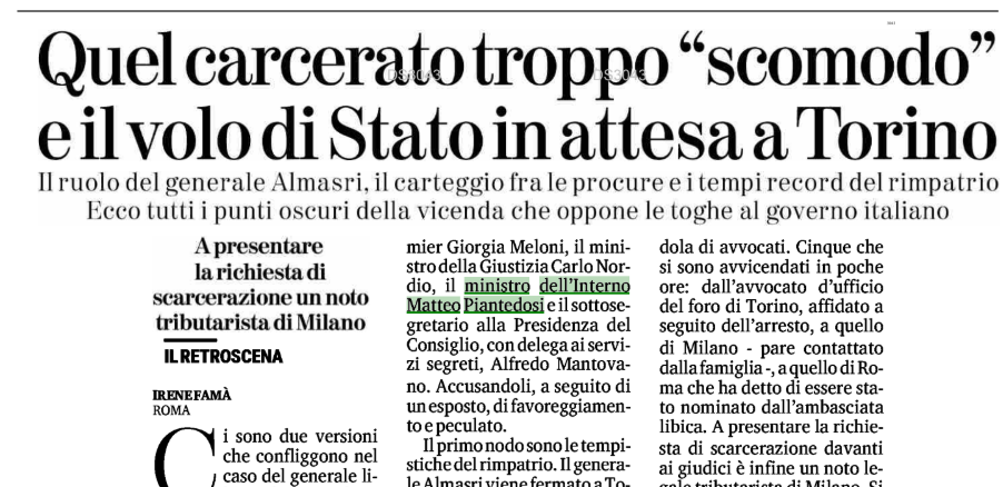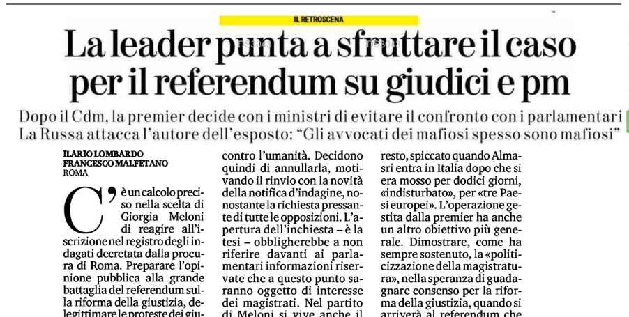 - Il Messaggero: Almasri, Meloni indagata / «Ma non sono ricattabile»