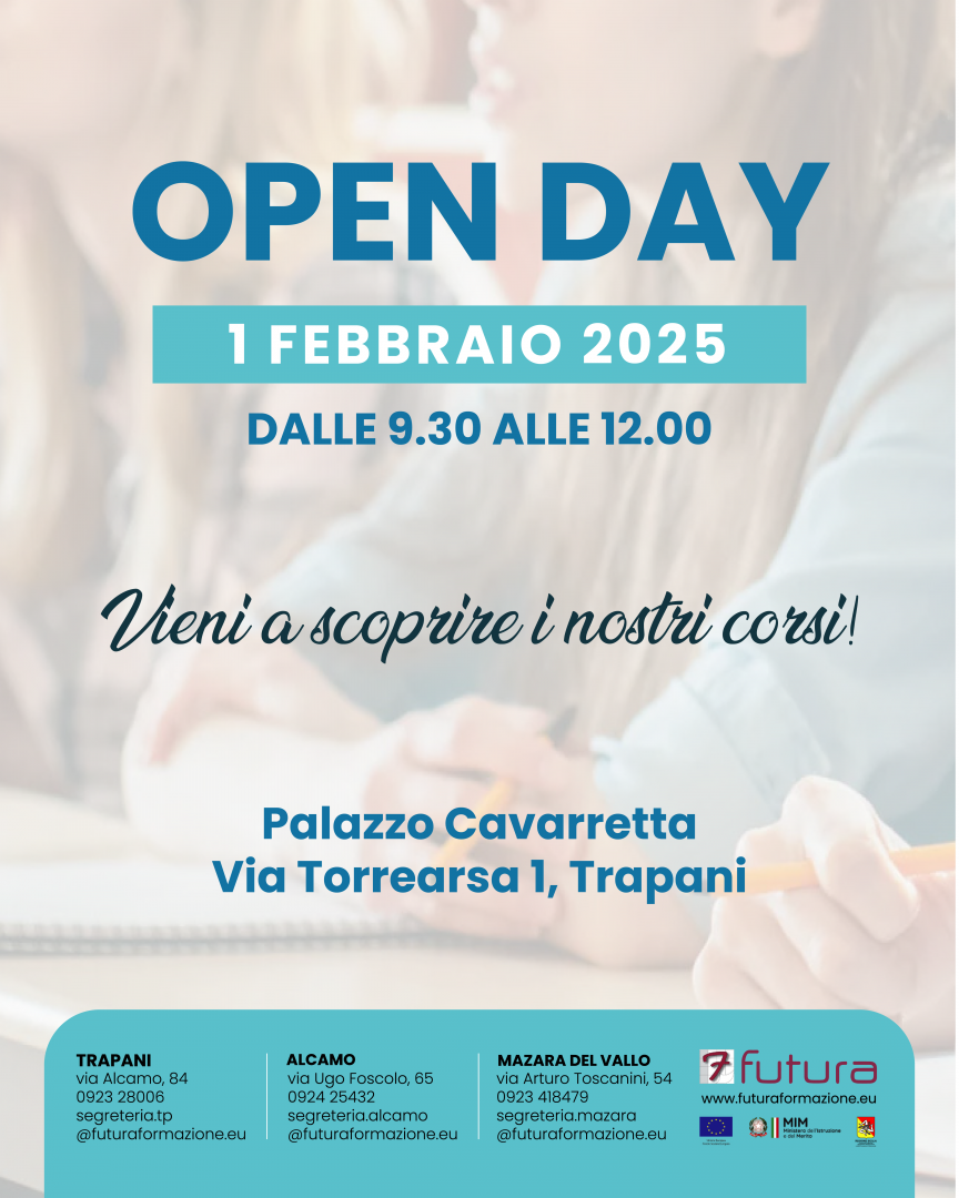L'Ente di Istruzione e Formazione Professionale Futura organizza un open day l’1 febbraio a Trapani, dalle ore 9.30 alle ore 12.00, presso il Palazzo Cavarretta, Via Torrearsa 1, per presentare l'offerta formativa 2025/2026.