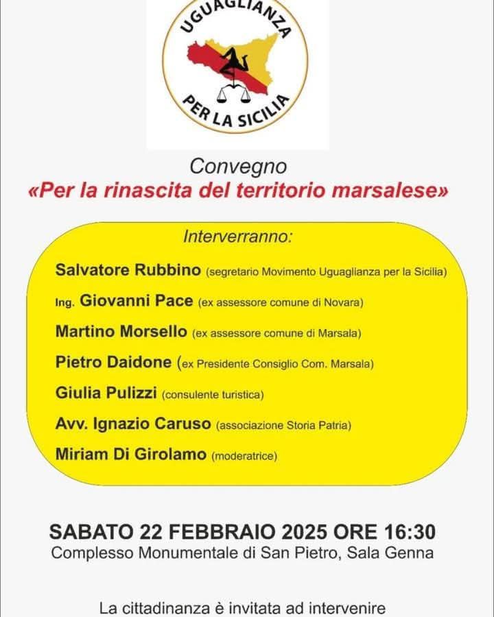 Il movimento Uguaglianza per la Sicilia organizza un importante convegno dal titolo "Per una rinascita del territorio marsalese", che si terrà il prossimo 22 Febbraio alle ore 16:30 presso la Sala "Enzo Genna" del Complesso monumentale San Pietro a Marsala. L'incontro rappresenta un'opportunità per la cittadinanza e per gli organi di stampa di confrontarsi su idee e progetti per la riqualificazione del territorio.