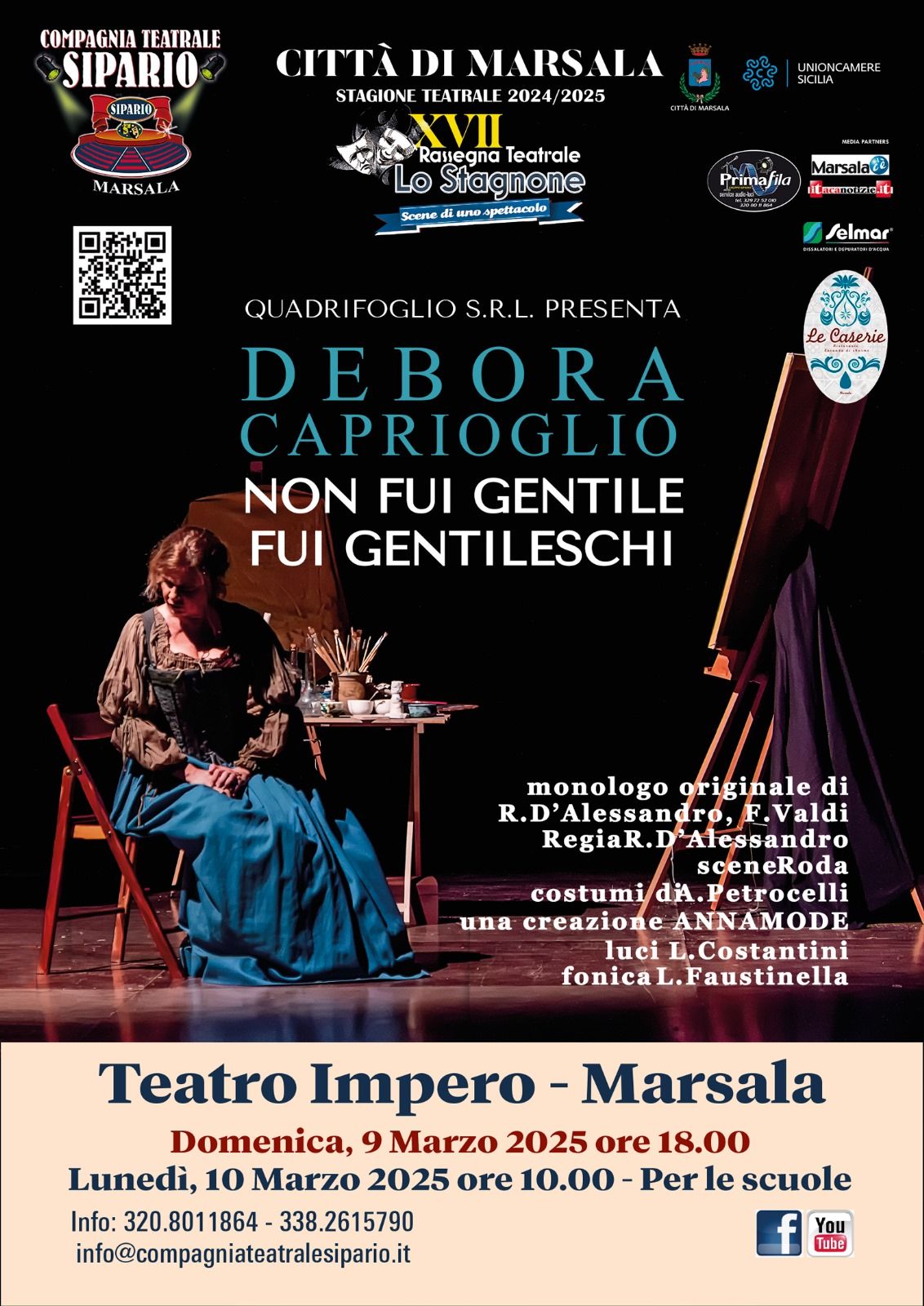 Domenica 9 marzo alle ore 18 si terrà l’atteso spettacolo: “Non fui gentile, fui Gentileschi” che vedrà Debora Caprioglio mettere in scena la vita di Artemisia Gentileschi, narrata da sé medesima. Si tratta di uno spettacolo iscritto nella “XVII Rassegna Lo Stagnone scene di uno spettacolo”, ideata e realizzata dalla Compagnia teatrale “Sipario” diretta da Vito Scarpitta.