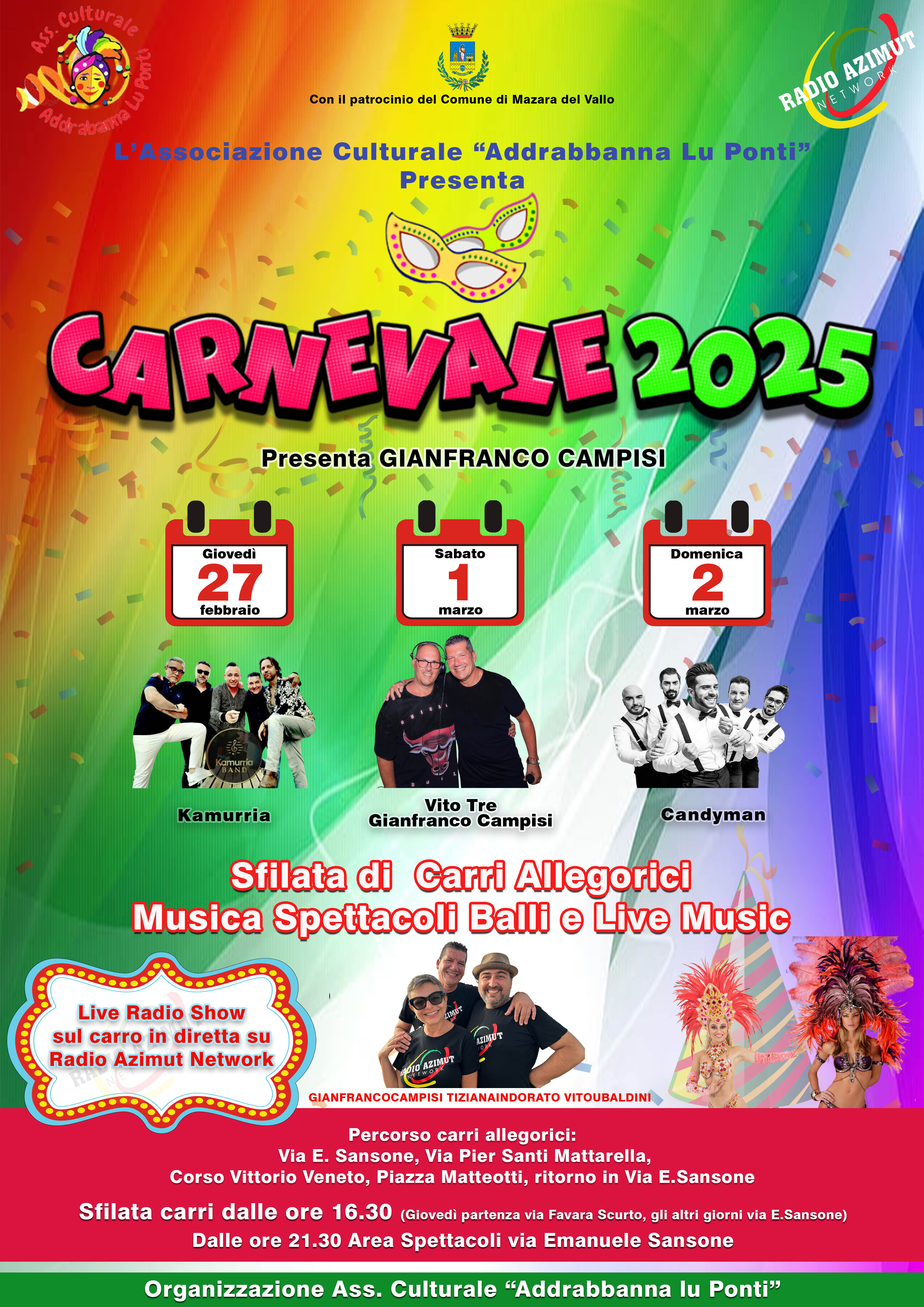 📅 Calendario eventi di Mazara: 27 febbraio: Partenza sfilata alle 16:30 da Via Favara Scurto; 1 e 2 marzo: Partenza sfilata alle 16:30 da Via Emanuele Sansone; Spettacoli serali: 27 febbraio: Concerto del gruppo Kamurria; 1 marzo: DJ set con Vito Tre e Gianfranco Campisi; 2 marzo: Concerto dei Candymen.