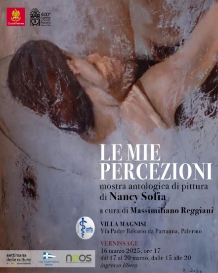 Domenica 16 marzo, dalle ore 17:00 alle 20:00, verrà inaugurata a Palermo la mostra pittorica "LE MIE PERCEZIONI " dell'artista Nancy Sofia, presso “Villa Magnisi” in via Padre Rosario da Partanna, gentilmente concessa dall' “Ordine dei Medici Chirurghi e degli Odontoiatri” della Provincia di Palermo. L’esposizione resterà aperta al pubblico dal 17 al 20 marzo, dalle ore 15:00 alle 20:00, con ingresso libero. L'evento è patrocinato dall'associazione "Settimana delle Culture" e curato dal critico d'arte Massimiliano Reggiani.
