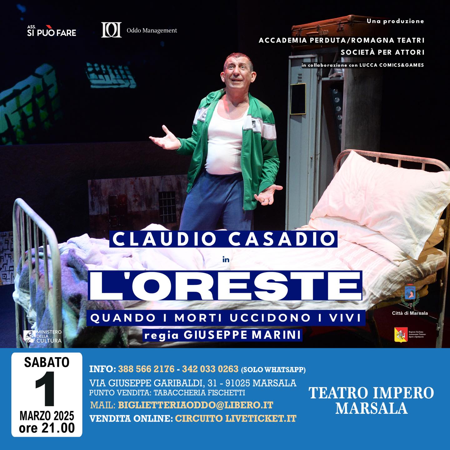 MARSALA - Sabato 1 marzo 2025, alle 21:00, il Teatro Impero di Marsala ospiterà "L'Oreste", spettacolo della Stagione teatrale 2024/2025 prodotta dall’associazione Si può fare. Scritto da Francesco Nicolini per Claudio Casadio, racconta la storia di un uomo rinchiuso da trent’anni in un ospedale psichiatrico, in un intreccio tra teatro e graphic novel, con le illustrazioni animate di Andrea Bruno. Biglietti da 27,50 a 38,50 euro, prevendite su liveticket.it.