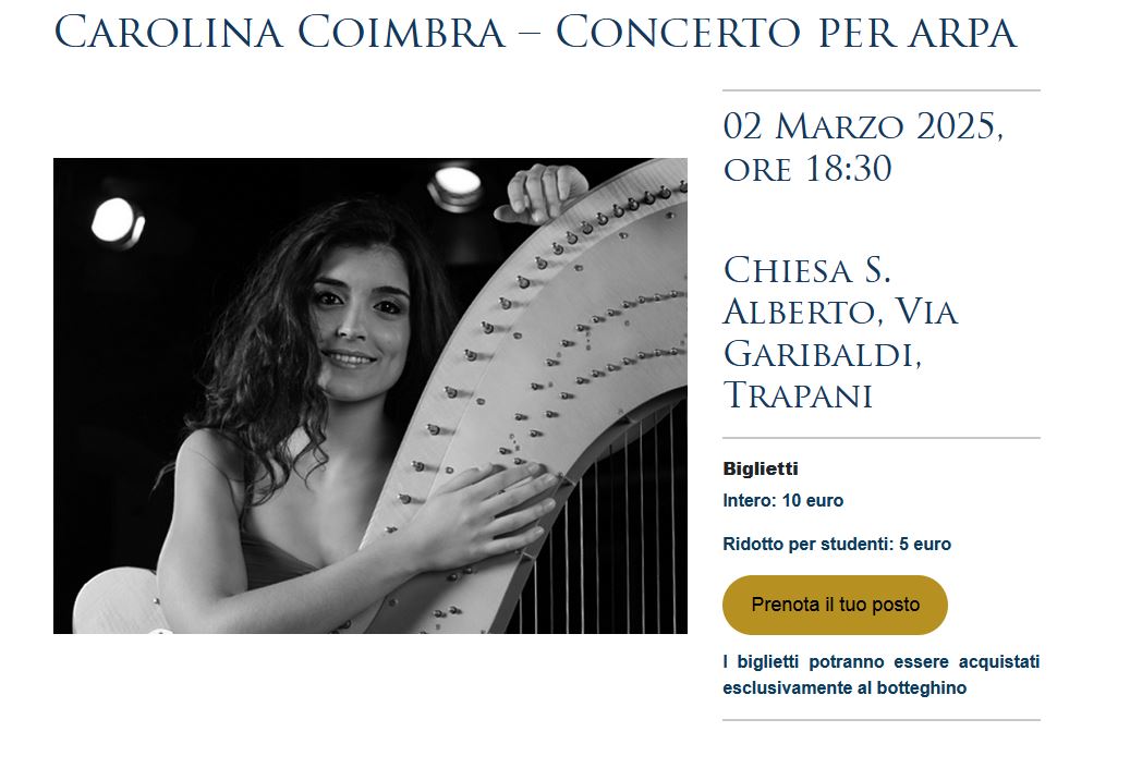 TRAPANI - Domenica 2 marzo, alle 18:30, la Chiesa S. Alberto di Trapani ospiterà il concerto per arpa di Carolina Coimbra. Il programma include brani di Rameau, Grandjany, C.P.E. Bach, Freitas Branco, Chopin e Bovio. I biglietti sono disponibili al botteghino al costo di 10 euro (ridotto per studenti: 5 euro), mentre gli abbonati ai concerti pomeridiani possono accedere senza prenotazione.