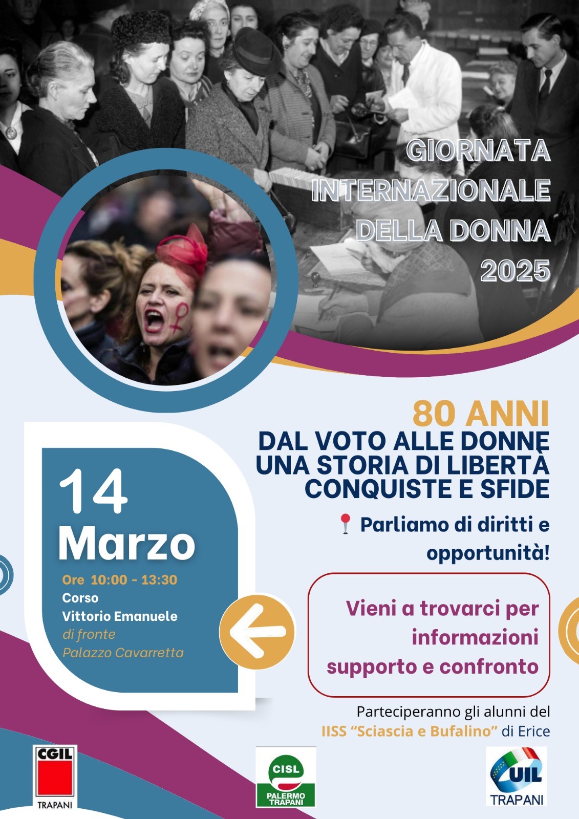 Tre i volantini realizzati da CGIL, CISL e UIL Trapani per l’iniziativa: -il primo approfondisce le battaglie ancora aperte, come l’instabilità occupazionale, il congedo parentale e la parità salariale; il secondo ripercorre le principali conquiste legislative ottenute dal 1945 a oggi. Il terzo raccoglie e analizza i dati Istat 2024 sulle disparità di genere nel mondo del lavoro e nelle istituzioni. Un’occasione, dunque, per informarsi, riflettere e ribadire che la parità di genere non è solo un traguardo, ma una sfida da portare avanti insieme.