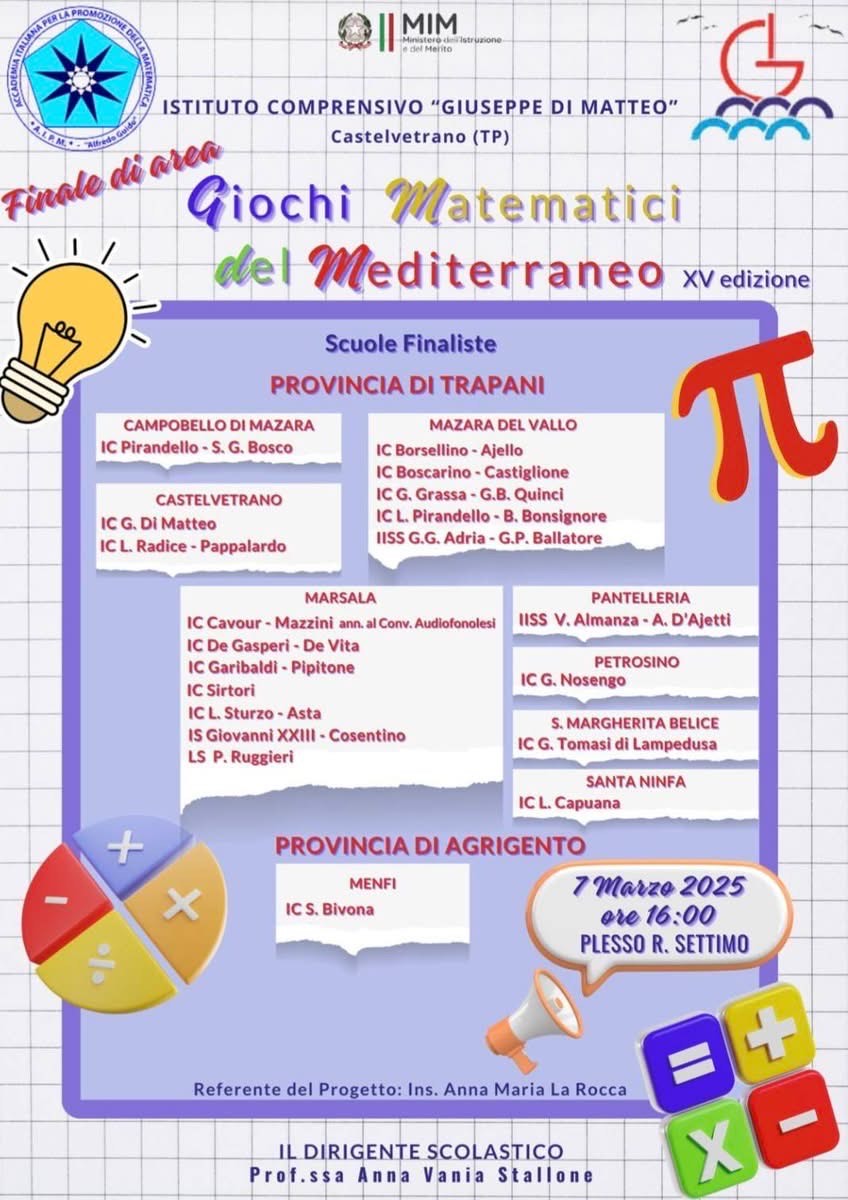 Venerdì 7 marzo 2025, l’Istituto Comprensivo “Giuseppe Di Matteo” ha ospitato la XV edizione della Finale di Area dei Giochi Matematici del Mediterraneo, organizzata dall’Accademia Italiana per la Promozione della Matematica (A.I.P.M.). La competizione si è svolta nei locali del plesso “Ruggero Settimo” e ha coinvolto 263 studenti provenienti da diverse scuole delle province di Trapani e Agrigento.