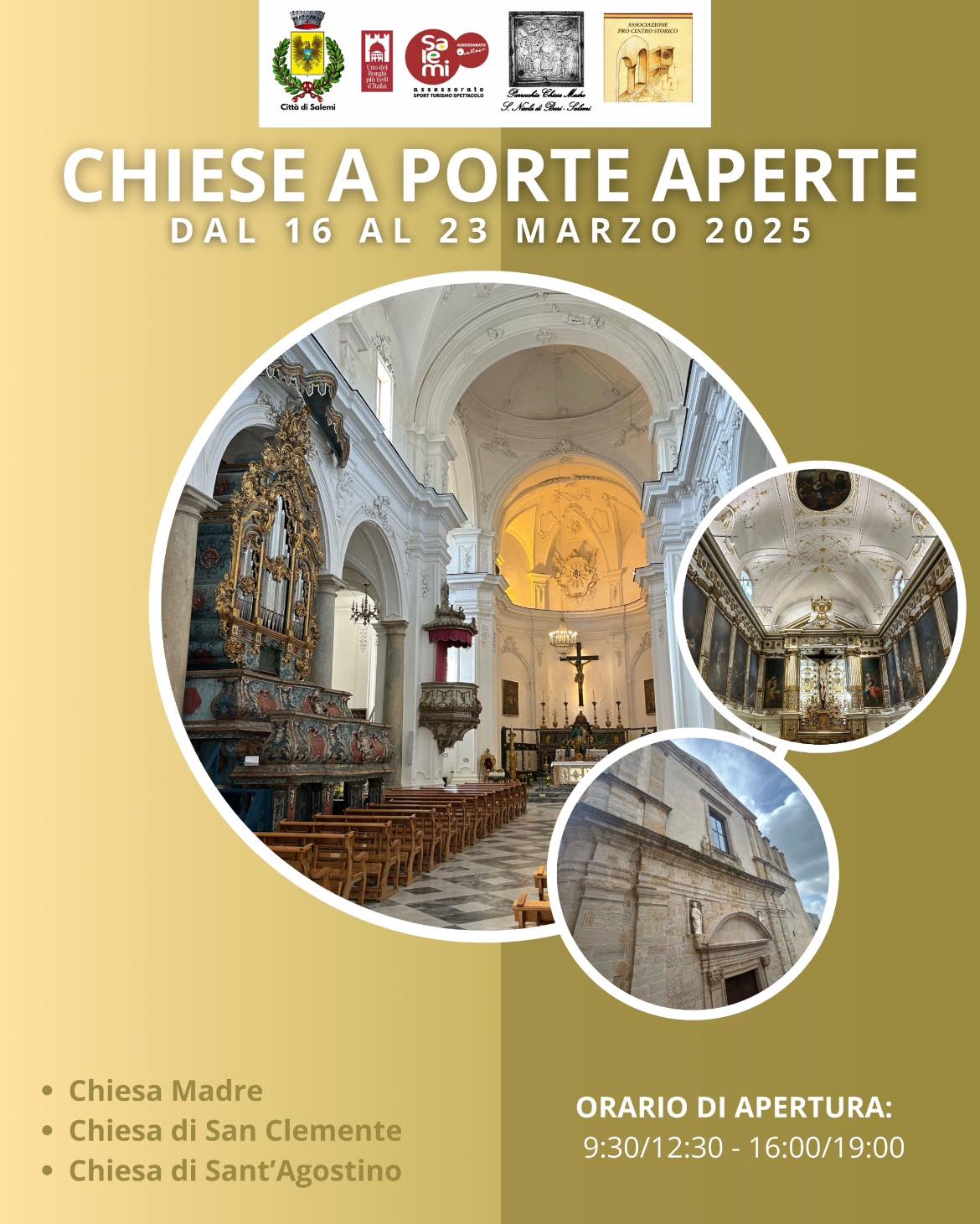 Le chiese di Sant’Agostino, San Clemente e la Chiesa Madre saranno visitabili grazie all’iniziativa Chiese a Porte Aperte, con orari di apertura dalle 9:30 alle 12:30 e dalle 16:00 alle 19:00.