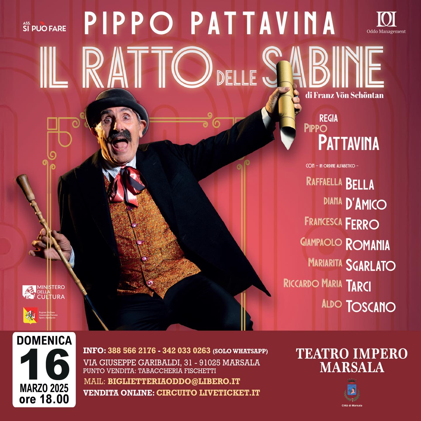 MARSALA - Domenica 16 marzo alle 21:00, al Teatro Impero di Marsala, andrà in scena Il Ratto delle Sabine, commedia diretta e interpretata da Pippo Pattavina.