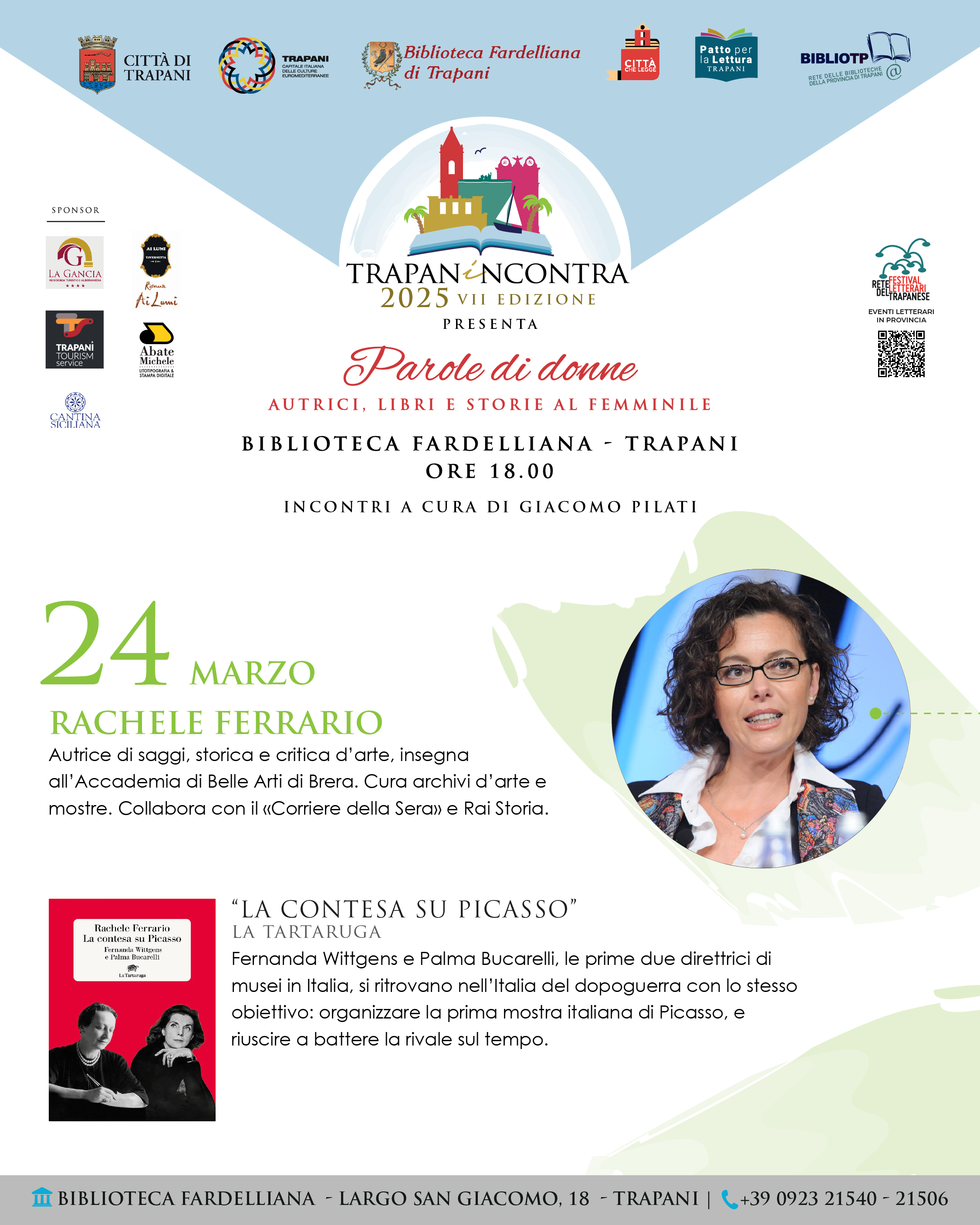 Per il ciclo di appuntamenti della VII edizione di TrapanIncontra "Parole di Donne", la rassegna dedicata alla saggistica e letteratura femminile contemporanea, lunedì 24 marzo, alle ore 18:00, la Biblioteca Fardelliana di Trapani ospiterà Rachele Ferrario, docente dell'Accademia di Brera e collaboratrice del "Corriere della Sera" e di Rai Storia, che presenterà il suo libro "La contesa su Picasso", pubblicato da La Tartaruga.