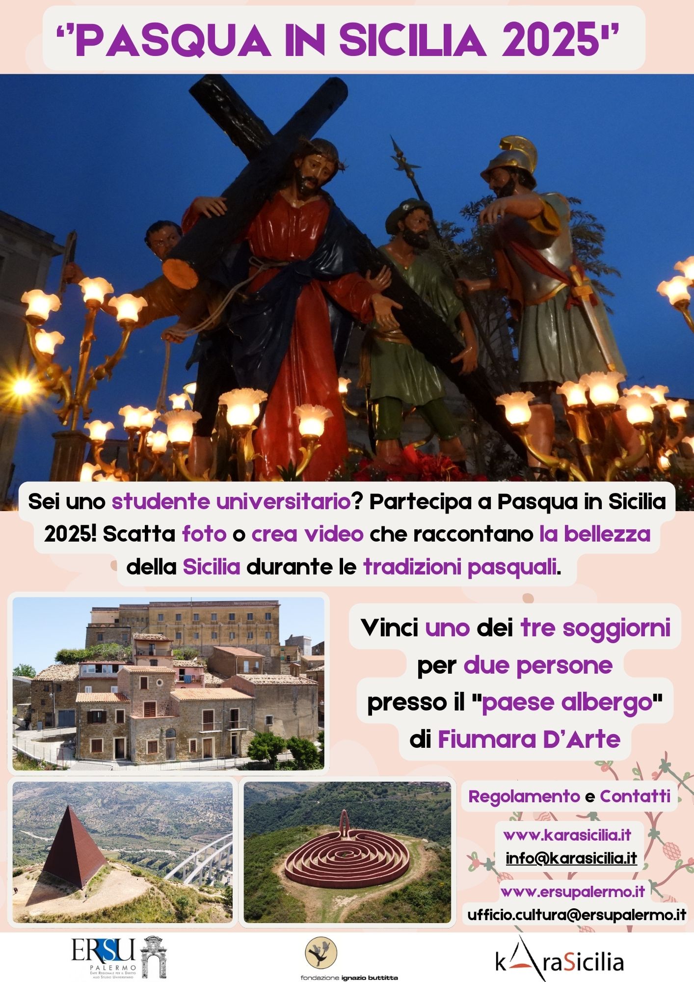 Nell'ambito di ERSU Festival 2024/25, ERSU Palermo insieme alla cooperativa sociale KARASICILIA e in collaborazione con la Fondazione Ignazio Buttitta, lancia il concorso per foto e video - riservato agli studenti delle università, delle accademie di belle arti e dei conservatori di musica della Sicilia occidentale - “Pasqua in Sicilia 2025”: un'iniziativa che mira a valorizzare la bellezza e la cultura dell'Isola; un'occasione per esprimere la creatività, raccontare e valorizzare le tradizioni del territorio; un modo per celebrare la Pasqua in Sicilia, mix di spiritualità, tradizione, gastronomia e convivialità che la rende una delle festività più sentite e celebrate dai siciliani.