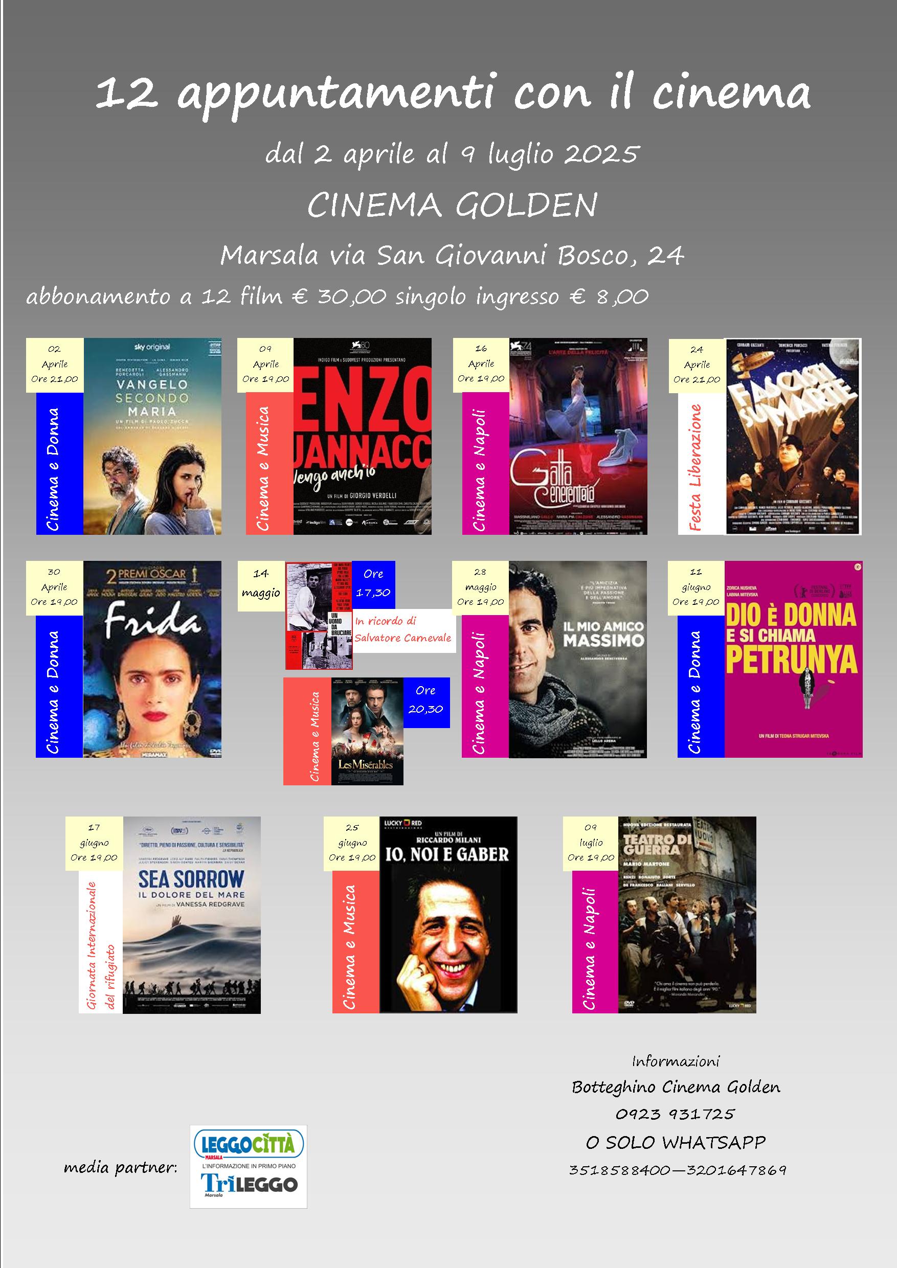 Il Cinema Golden di Marsala apre le porte alla sua prima rassegna cinematografica con "Incontriamoci al Cinema", un ciclo di dodici film suddivisi in tre capitoli tematici e tre eventi speciali. Un'iniziativa volta a riportare il pubblico in sala, promuovendo il grande schermo come spazio di incontro e riflessione.