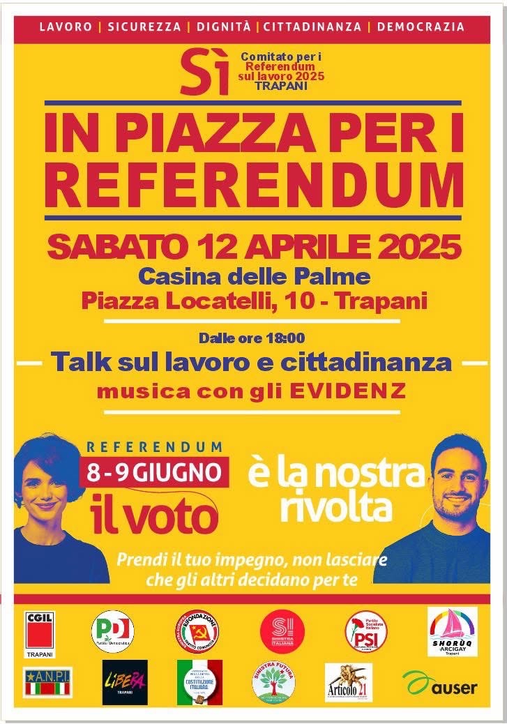 L’evento trapanese inaugura una serie di iniziative che attraverseranno il Paese per sensibilizzare i cittadini sull'importanza del voto referendario e per promuovere una partecipazione consapevole e attiva. Al centro del dibattito ci saranno i temi del lavoro e della cittadinanza, affrontati in un talk in cui si alterneranno le voci dei rappresentanti sindacali e dei soggetti collettivi che hanno aderito alla campagna per il Sì.