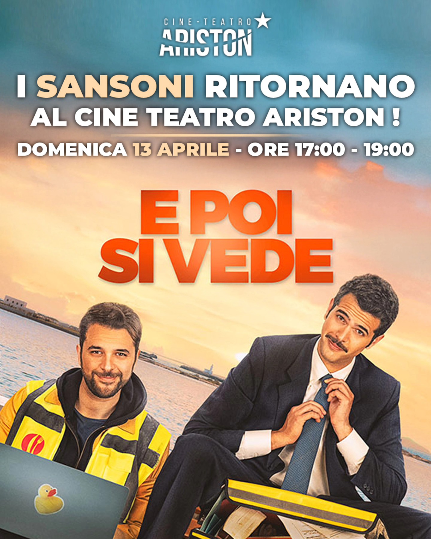 TRAPANI - Domenica 13 aprile, al Cine Teatro Ariston, verranno proiettati due spettacoli del film "E Poi Si Vede" di Giovanni Calvaruso, alle 17:00 e alle 19:00. I protagonisti "I Sansoni" saranno presenti in sala per incontrare il pubblico.