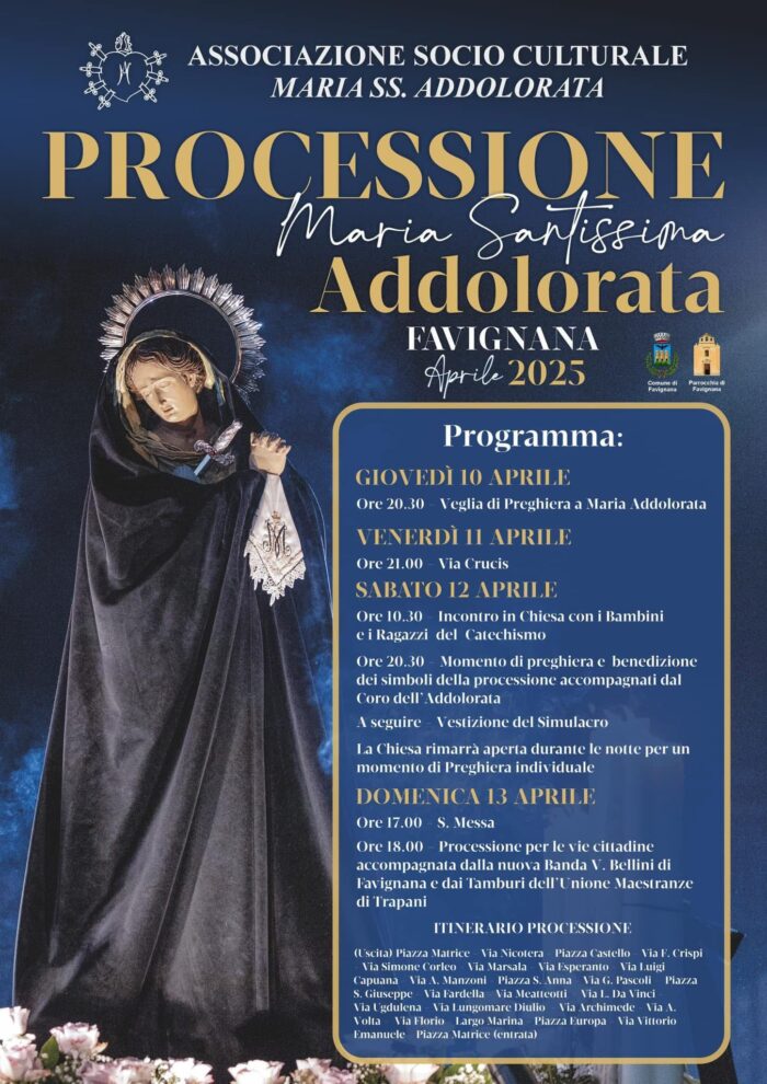 FAVIGNANA - Sabato 12 aprile, alle 20:30, si terrà la Vestizione del Simulacro dell'Addolorata con la benedizione dei simboli che accompagneranno la processione, a cui parteciperà il Coro dei bambini dell'Addolorata. Domenica 13 aprile, alle 17:00, si celebrerà la Santa Messa, seguita dalla processione dell'Addolorata con i solenni Tamburi dell'Unione Maestranze di Trapani e la Banda Musicale Nuova Vincenzo Bellini di Favignana. Questi eventi si svolgeranno in un'atmosfera unica, arricchita dalle riprese del film "The Odyssey" di Christopher Nolan, che vede l'isola come set cinematografico.