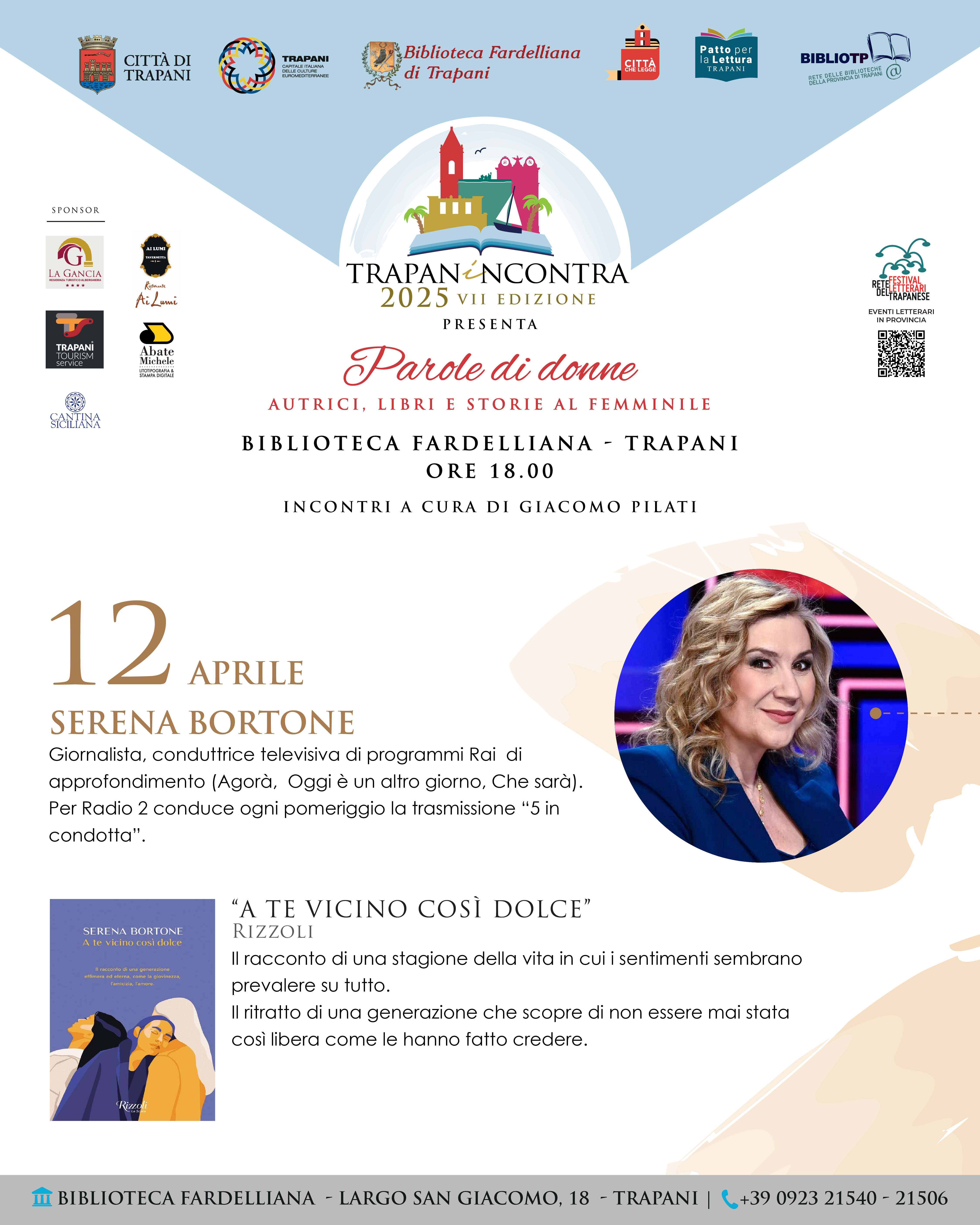 TRAPANI - Sabato 12 aprile 2025, alle 18:00, la Biblioteca Fardelliana di Trapani ospiterà Serena Bortone, che presenterà il suo libro "A te vicino così dolce" nell’ambito della VII edizione di TrapanIncontra "Parole di Donne". L'incontro, moderato da Giacomo Pilati, esplorerà tematiche legate alle relazioni umane e alle aspettative generazionali. L'ingresso è libero fino a esaurimento posti.
