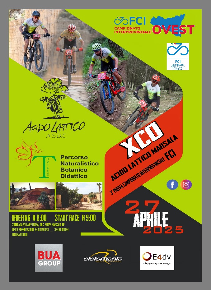 Marsala si prepara ad accogliere uno degli appuntamenti più attesi del calendario ciclistico siciliano: domenica 27 aprile 2025 si terrà ACIDO LATTICO MARSALA, terza prova del Campionato Interprovinciale Ovest XCO, un evento che rappresenta un importante momento di crescita e valorizzazione per la A.S.D.C. Acido Lattico, da anni impegnata nella promozione del ciclismo fuoristrada.