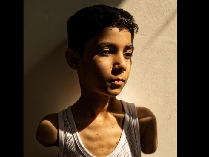 Mahmoud Ajjour è rimasto gravemente ferito nel marzo 2024, mentre fuggiva da un attacco israeliano a Gaza City. Si era voltato per incitare la famiglia a proseguire, quando un’esplosione gli ha amputato un braccio e devastato l’altro. L’intera famiglia è stata evacuata in Qatar dove, dopo un intervento medico, Mahmoud sta imparando a giocare con il telefono, scrivere e aprire le porte usando i piedi. Il sogno di Mahmoud è avere delle protesi e vivere la propria vita come qualunque altro bambino. Secondo le stime delle Nazioni Unite, a dicembre 2024 Gaza contava il più alto numero pro capite di bambini amputati al mondo.