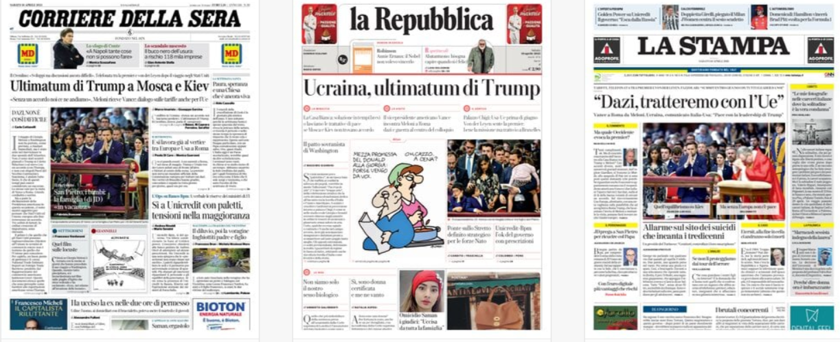 • Il vicepresidente degli Stati Uniti J.D. Vance si è intrattenuto per due ore con Giorgia Meloni a Palazzo Chigi. Durante il colloquio ha offerto la disponibilità degli Usa a trattare con Bruxelles sui dazi. Vance oggi incontrerà il segretario di Stato vaticano, il cardinale Parolin e spera di salutare il Papa