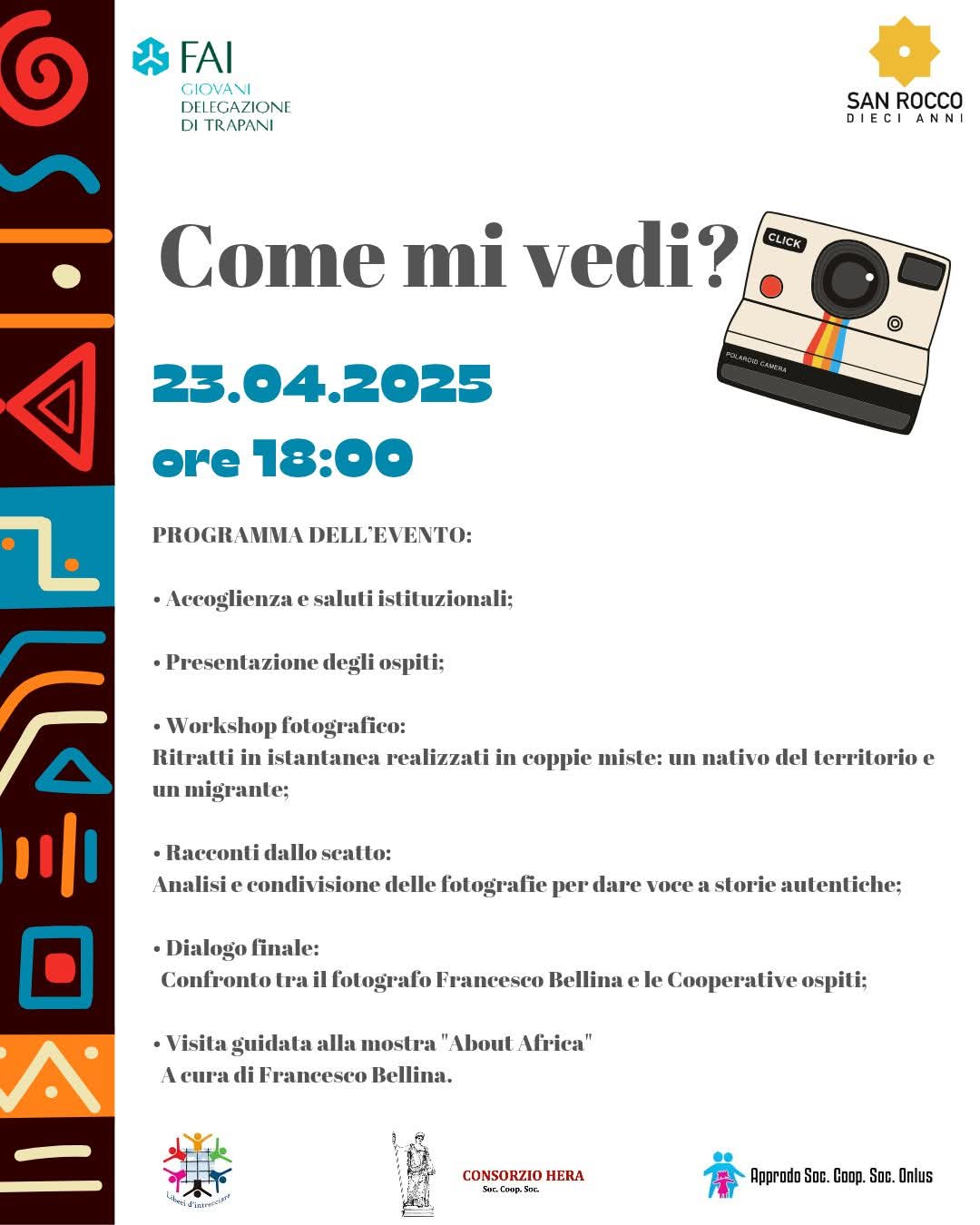 In occasione della chiusura della mostra, il gruppo FAI Giovani di Trapani organizza l'evento "Come mi vedi?" che prevede la realizzazione di ritratti fotografici in coppie miste, composte da un nativo del territorio e un migrante. L’iniziativa sarà seguita da un dibattito pubblico, al quale parteciperanno Francesco Bellina, la Cooperativa Liberi di Intrecciare, il Consorzio Hera e Approdo Soc. Coop. Soc. Onlus, per discutere il ruolo della percezione e della rappresentazione dell'altro, affrontando anche temi legati all'accoglienza e all'integrazione.