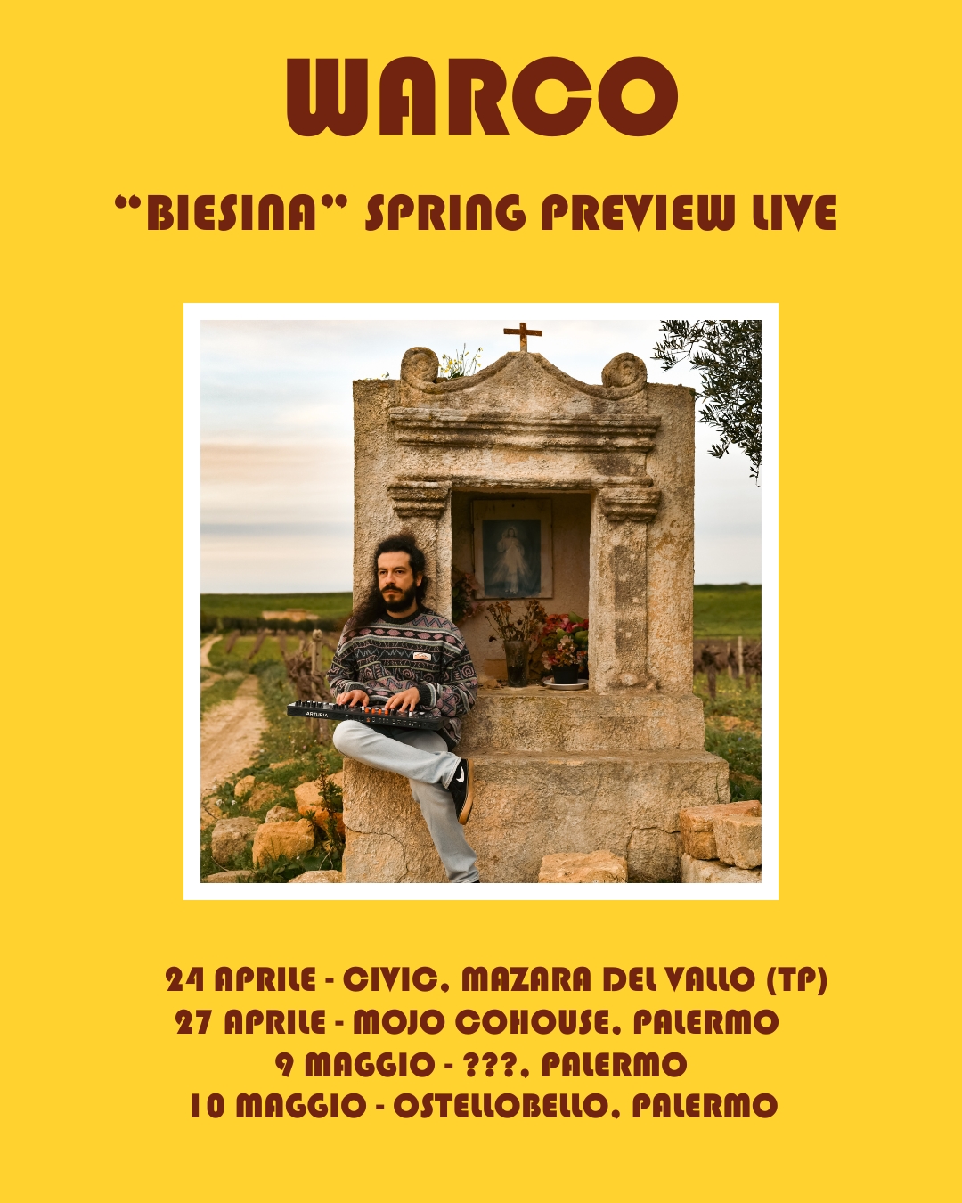 Sfumata la possibilità di calcare il palco del primo maggio a Roma dopo il mancato accesso alle semifinali del Contest “1mnext 2025” indetto da Rai e iCompany, il cantautore marsalese Warco torna dal vivo con quattro date che anticipano l’uscita del suo primo EP, “Biesina”.