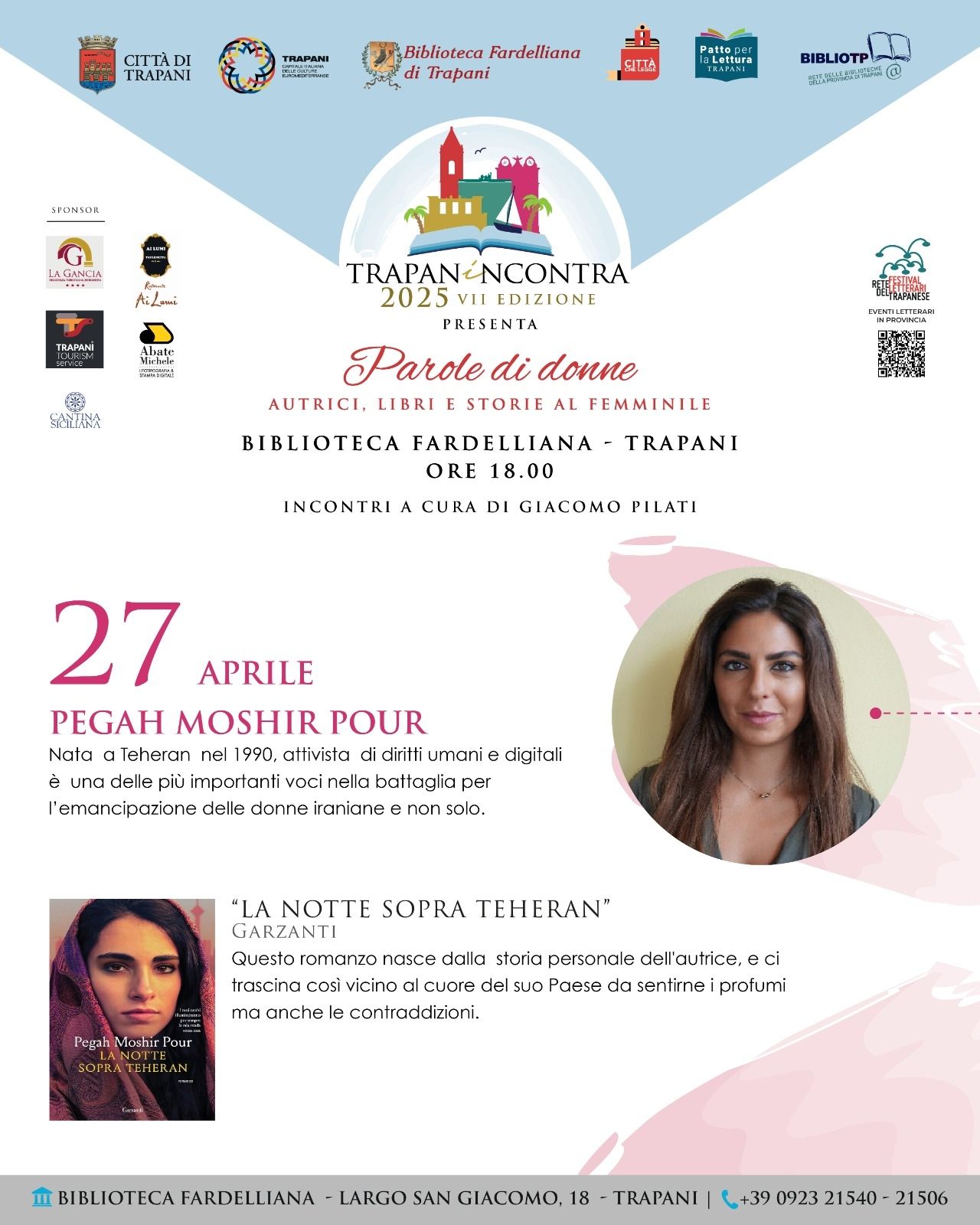 TRAPANI - Domenica 27 aprile , alle 18:00, la Biblioteca Fardelliana di Trapani ospiterà Pegah Moshir Pour, attivista per i diritti umani, che presenterà il suo libro "La notte sopra Teheran". Il racconto autobiografico esplora la realtà dell'Iran contemporaneo, con un focus sulla lotta per la libertà e i diritti delle donne. L'incontro sarà moderato da Giacomo Pilati e l'ingresso è gratuito fino a esaurimento posti.