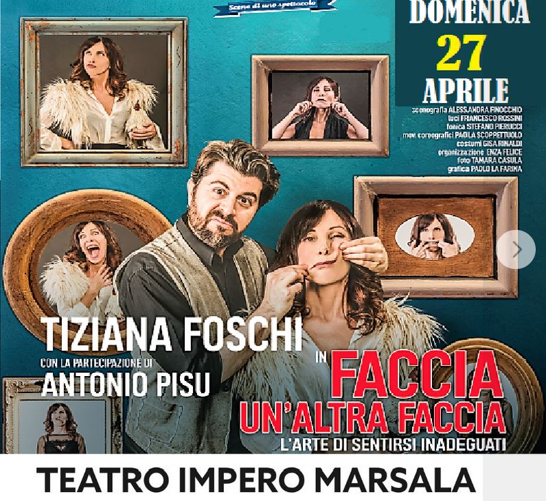MARSALA - Domenica 27 aprile, alle ore 18:00, il Teatro Impero ospita lo spettacolo "Faccia un'altra faccia - L'arte di sentirsi inadeguati", con Tiziana Foschi e Antonio Pisu. L'attrice, storica componente della Premiata Ditta, metterà in scena un'esilarante parodia sulle "facce" e le tipologie umane, trasformando situazioni quotidiane in momenti di comicità. Il biglietto è acquistabile presso I Viaggi dello Stagnone e la Tabaccheria Fischetti, oppure online su LiveTicket. Per info, contattare il 320.8011864.