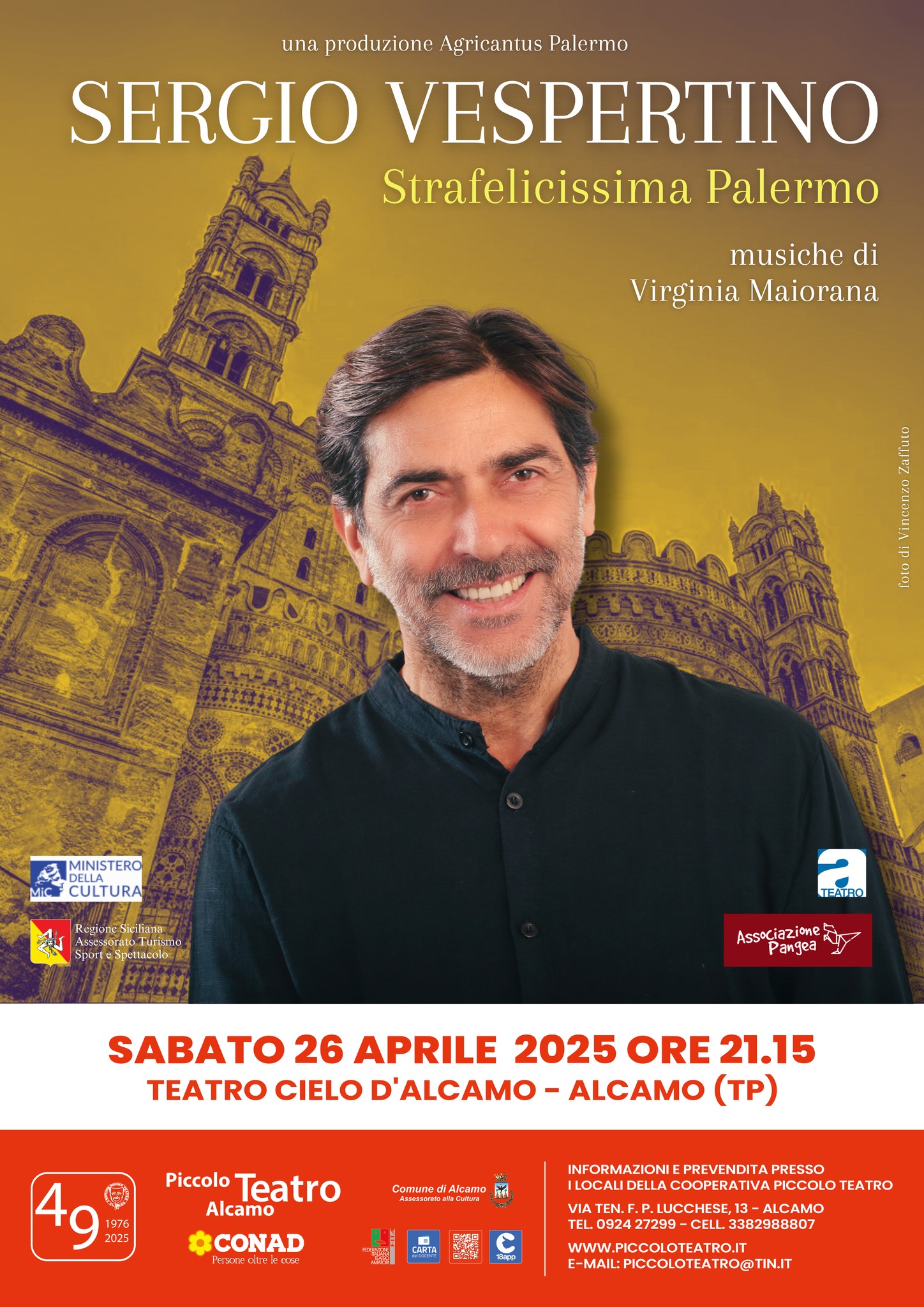 ALCAMO - Il 26 aprile, alle 21:15, il Teatro Cielo D'Alcamo ospiterà lo spettacolo "Strafelicissima Palermo" con Sergio Vespertino, nell'ambito della XL edizione della Rassegna della Prosa e dello Spettacolo.