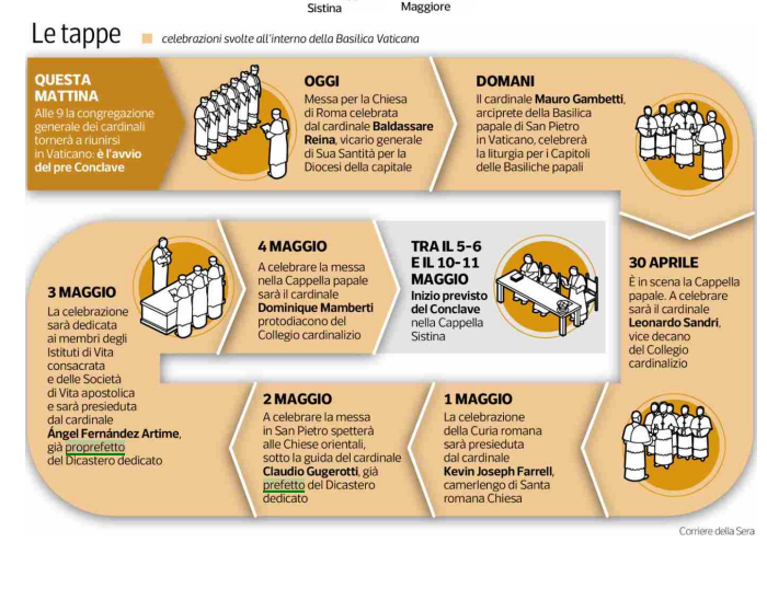 • Aperta al pubblico la tomba di papa Francesco a Santa Maria Maggiore. Ieri 30 mila fedeli gli hanno reso omaggio. Chiude la Cappella Sistina e si apre il pre-conclave