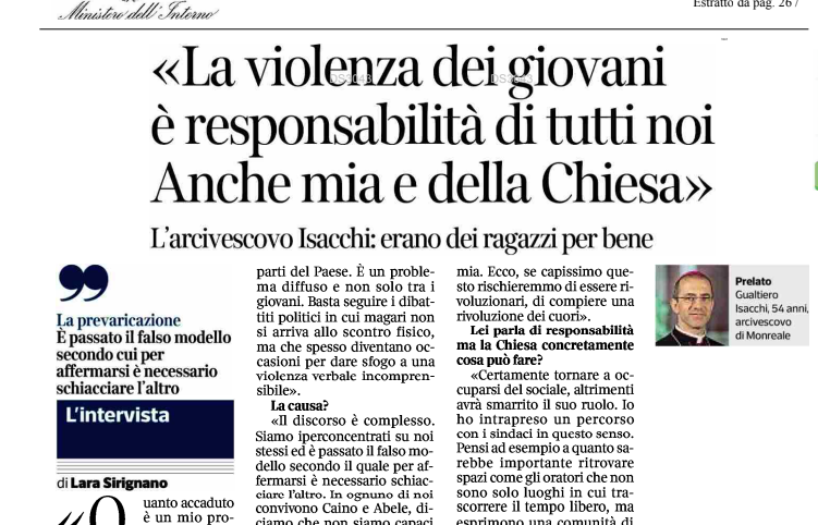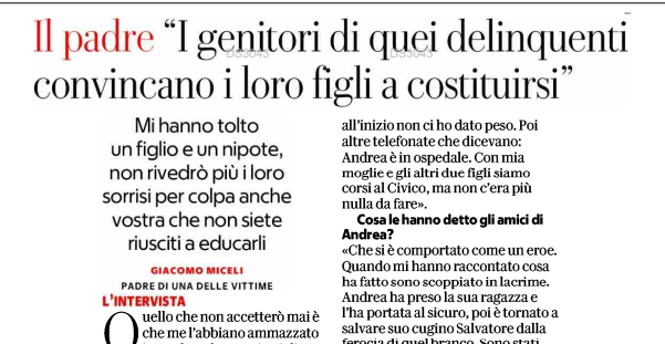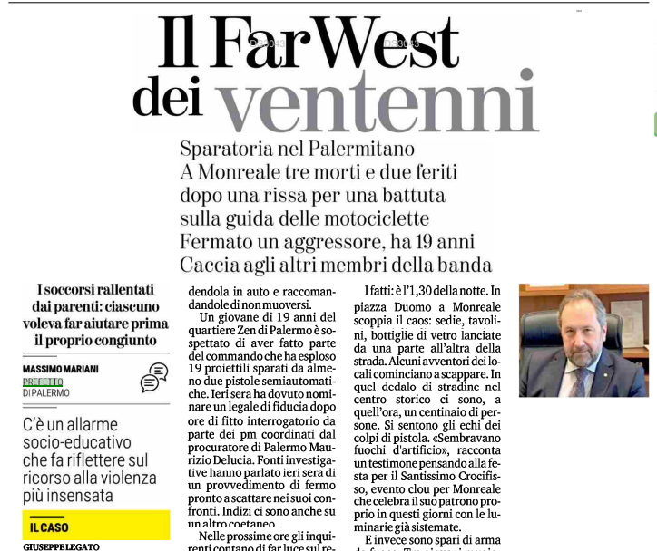 • A Monreale (Palermo) tre giovani sono morti ammazzati durante una sparatoria in strada. A Bologna un ragazzo di 19 anni è stato ucciso a calci, pugni e spintoni. Qui l'articolo di Tp24.