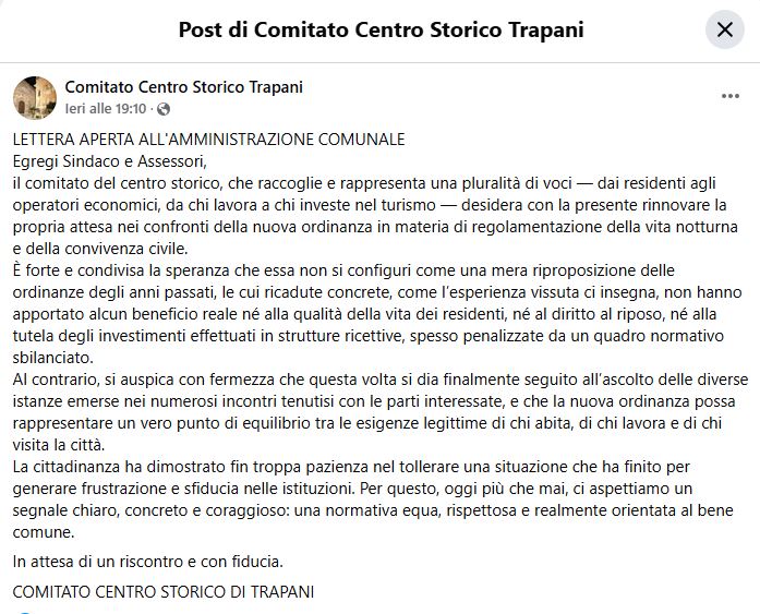 Vita notturna, lavoro e diritto al riposo: tre esigenze conciliabili. Con questa prospettiva, il comitato del centro storico di Trapani chiede con forza un cambiamento di passo: un regolamento capace di bilanciare le esigenze di chi vive, lavora e visita la città, superando le criticità del passato e restituendo fiducia nelle istituzioni.