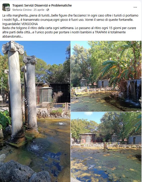 Bagni pubblici aperti ma inagibili, vasca invasa dalla melma e lavori di decoro realizzati solo all’ultimo minuto. È polemica sulla gestione della Villa Margherita a Trapani, esplosa in Consiglio comunale a seguito dell’interrogazione presentata dalla consigliera di Fratelli d’Italia, Grazia Spada, dopo il Trapani Comix. Un evento che ha richiamato migliaia di persone nel parco botanico simbolo della città, ma che, secondo la consigliera, ha messo in luce il degrado strutturale e igienico dell’area.