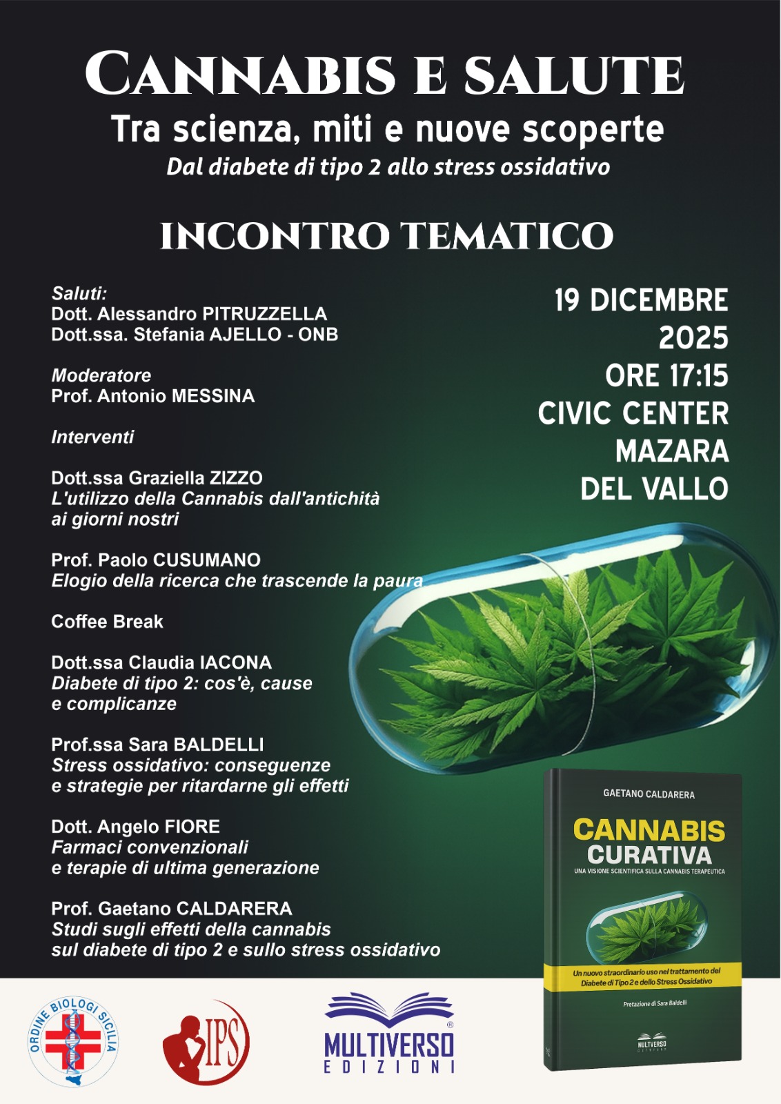 Si parlerà di Cannabis, scienza e salute al Civic Center di Mazara del Vallo in corso Vittorio Veneto, 201. L’appuntamento è per venerdì 19 dicembre, alle 17,15 presso la sala convegni, dove sarà presentato il libro di Gaetano Caldarera “Cannabis Curativa. Una visione scientifica sulla cannabis terapeutica”.