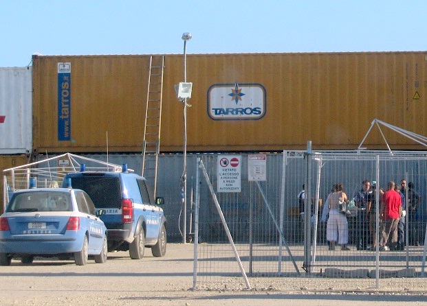 Tre metri di base per cinque di altezza, saldata tra due colonne di container. È l'ingresso del campo. Attraverso le maglie di ferro spuntano le dita di chi si tiene aggrappato al cancello tutto il giorno, per far respirare lo sguardo. Perché da dentro si vedono soltanto il muro di cinta dei container e il cielo bianco di questa torrida estate, attraversato soltanto dai cacciabombardieri diretti in Libia e dai voli della Ryanair per il vicinissimo aeroporto di Trapani Birgi. Guardando tra le sbarre si intravede la tendopoli allestita sull'asfalto della malandata pista del vecchio aeroporto militare di Chinisia, è esattamente come nel video girato con il cellulare che mi ha mandato con il
