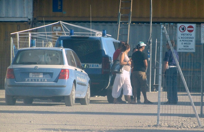 circolare 1305 del primo aprile lo vieta. Ma abbiamo deciso di provare lo stesso. Parcheggiamo la macchina nel piazzale e approfittando del via vai del cambio turno degli operatori ci avviciniamo con estrema disinvoltura verso la gabbia, come se fosse la cosa più normale da fare. Nessun agente ci chiede di identificarci e in pochi passi siamo sotto la gabbia di ferro.