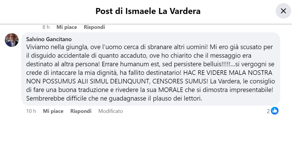 “Viviamo nella giungla, ove l’uomo cerca di sbranare altri uomini! Mi ero già scusato per il disguido accidentale di quanto accaduto, ove ho chiarito che il messaggio era destinato al altra persona! Errare humanum est, sed persistere belluis!!!!!… Si vergogni se crede di intaccare la mia dignità, ha fallito destinatario! HAC RE VIDERE MALA NOSTRA NON POSSUMUS ALII SIMUL DELINQUUNT, CENSORES SUMUS! La Vardera, le consiglio di fare una buona traduzione e rivedere la sua MORALE che si dimostra impresentabile! Sembrerebbe difficile che ne guadagnasse il plauso dei lettori.”