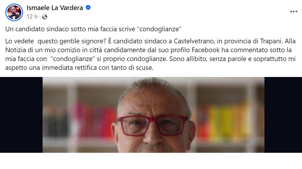 Lo vedete questo gentile signore? È candidato sindaco a Castelvetrano, in provincia di Trapani. Alla Notizia di un mio comizio in città candidamente dal suo profilo Facebook ha commentato sotto la mia faccia con “condoglianze” si proprio condoglianze. Sono allibito, senza parole e soprattutto mi aspetto una immediata rettifica con tanto di scuse.